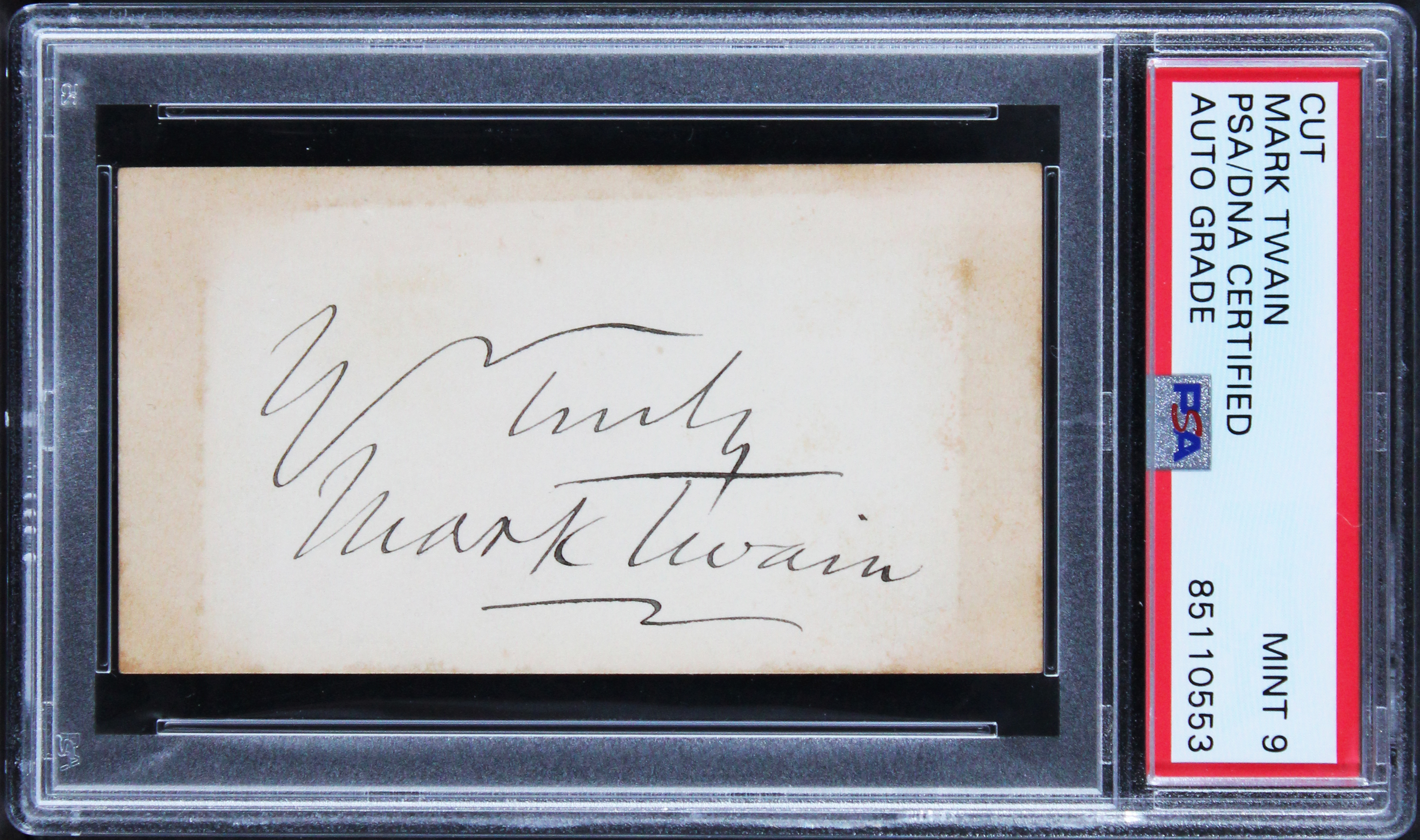 This Autographed Auto Graded Mint 9! 2x3.5 Cut Signature with the inscription of "Yours Truly, Mark Twain" has been Personally Signed by Samuel Clemens. This item is 100% Authentic, it comes slabbed and authenticated by PSA/DNA. The authenticity can be verified on Professional Sports Authenticator website.