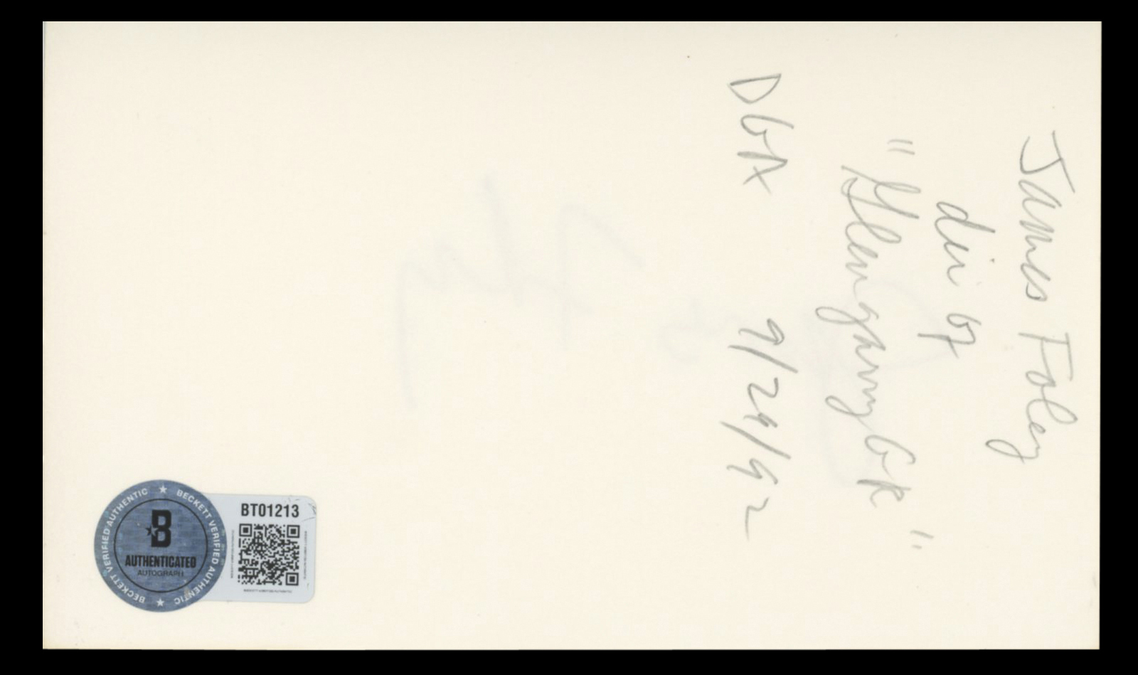 This Autographed 3x5 Index Card has been Personally Signed by James Foley. This item is 100% Authentic to include a hologram by Beckett Authentication Services. This item will come with an affixed Beckett Authentication Services (BAS) authentication sticker, which includes a scannable QR code to verify authenticity. Please note that Beckett no longer provides serial-numbered COA cards, and the attached BAS sticker will serve as the complete authentication for this item. The authenticity can be verified on Beckett Authentication Services website.