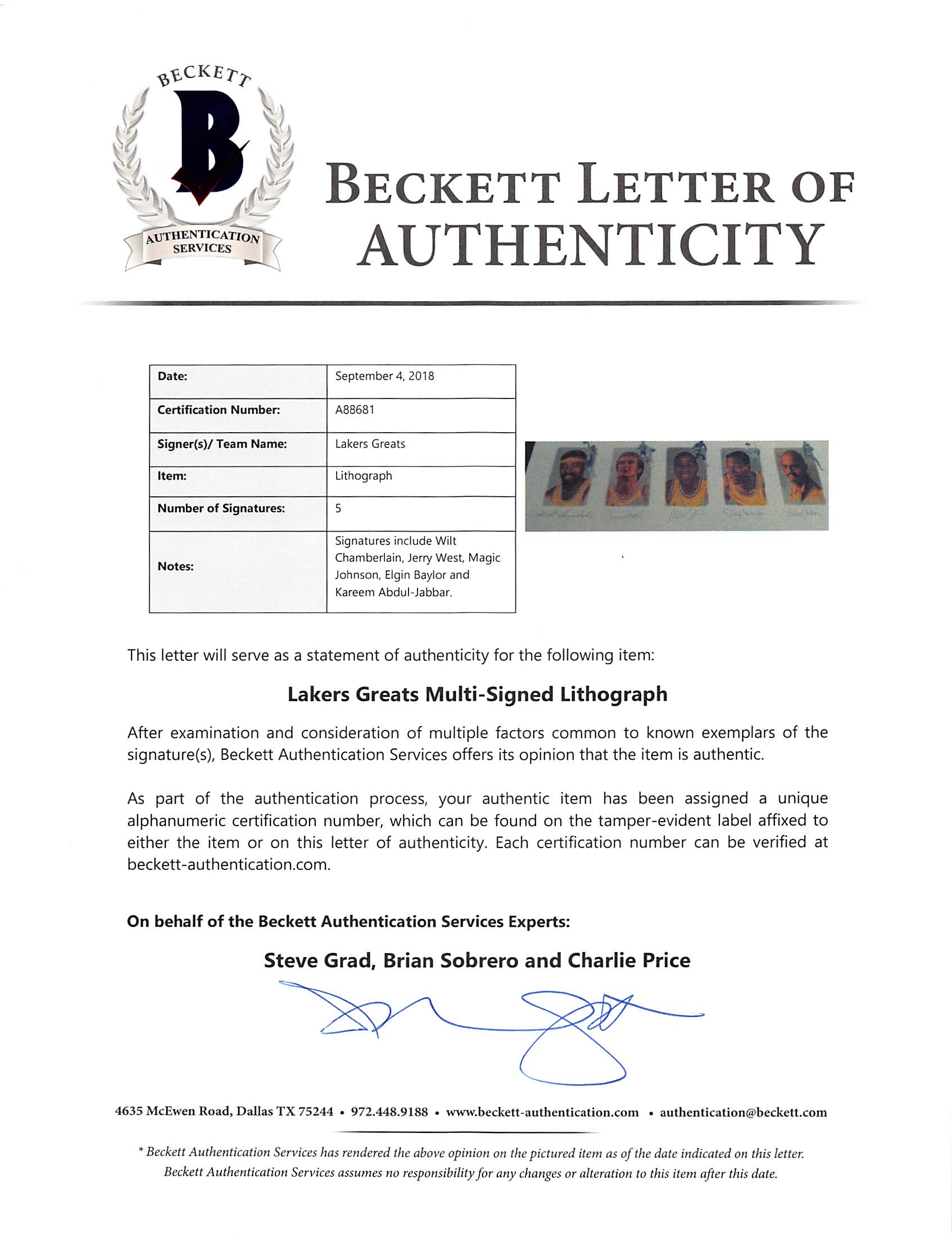 This Autographed & Framed 22x39 Lithograph has been Personally Signed by Wilt Chamberlain, Kareem Abdul-Jabbar, Magic Johnson, Jerry West & Elgin Baylor of the Los Angeles Lakers. This item is 100% Authentic to include a Certificate of Authenticity (COA) / hologram by Beckett Authentication Services. We have multiples of this same item. While the photographs are representative of this item, the size, placement and strength of the signature may vary. Each item is hand signed, therefore, each autograph is unique. This item has been professionally framed to overall dimensions of approximately 33.5 x 44.5 inches. Sample Letter of Authenticity attached.