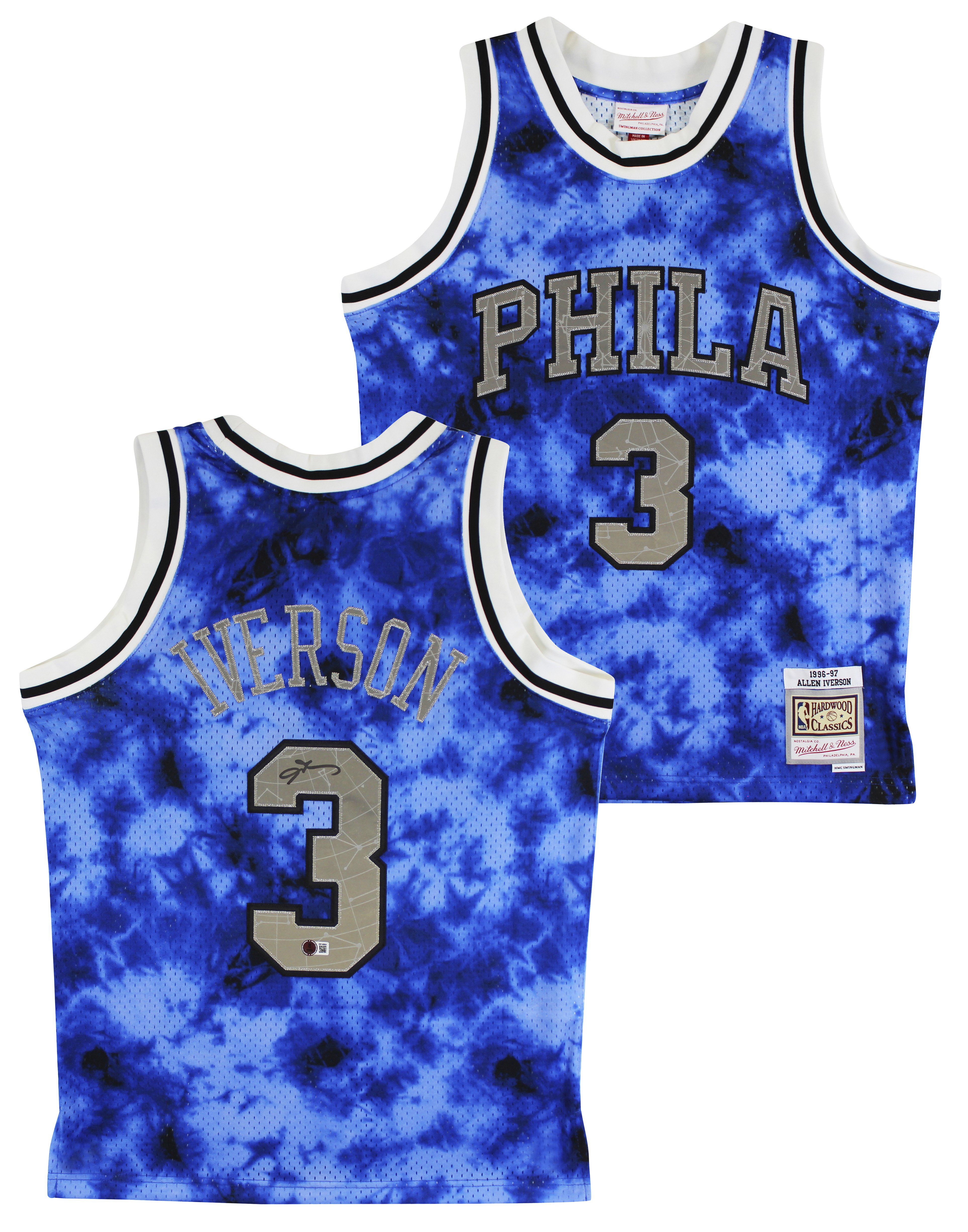 This Autographed Blue Galaxy Mitchell & Ness 1996-97 Hardwood Classics Swingman Jersey has been Personally Signed by Allen Iverson of the Philadelphia 76ers. This item is 100% Authentic to include a hologram by Beckett Authentication Services. This item will come with an affixed Beckett Authentication Services (BAS) authentication sticker, which includes a scannable QR code to verify authenticity. Please note that Beckett no longer provides serial-numbered COA cards, and the attached BAS sticker will serve as the complete authentication for this item. This is a BAS Witnessed Protection Program item which means a Beckett Authentication Service representative was present when this item was being signed. We have multiples of this same item. While the photographs are representative of this item, the size, placement and strength of the signature may vary. Each item is hand signed, therefore, each autograph is unique. This is a Medium sized Jersey.