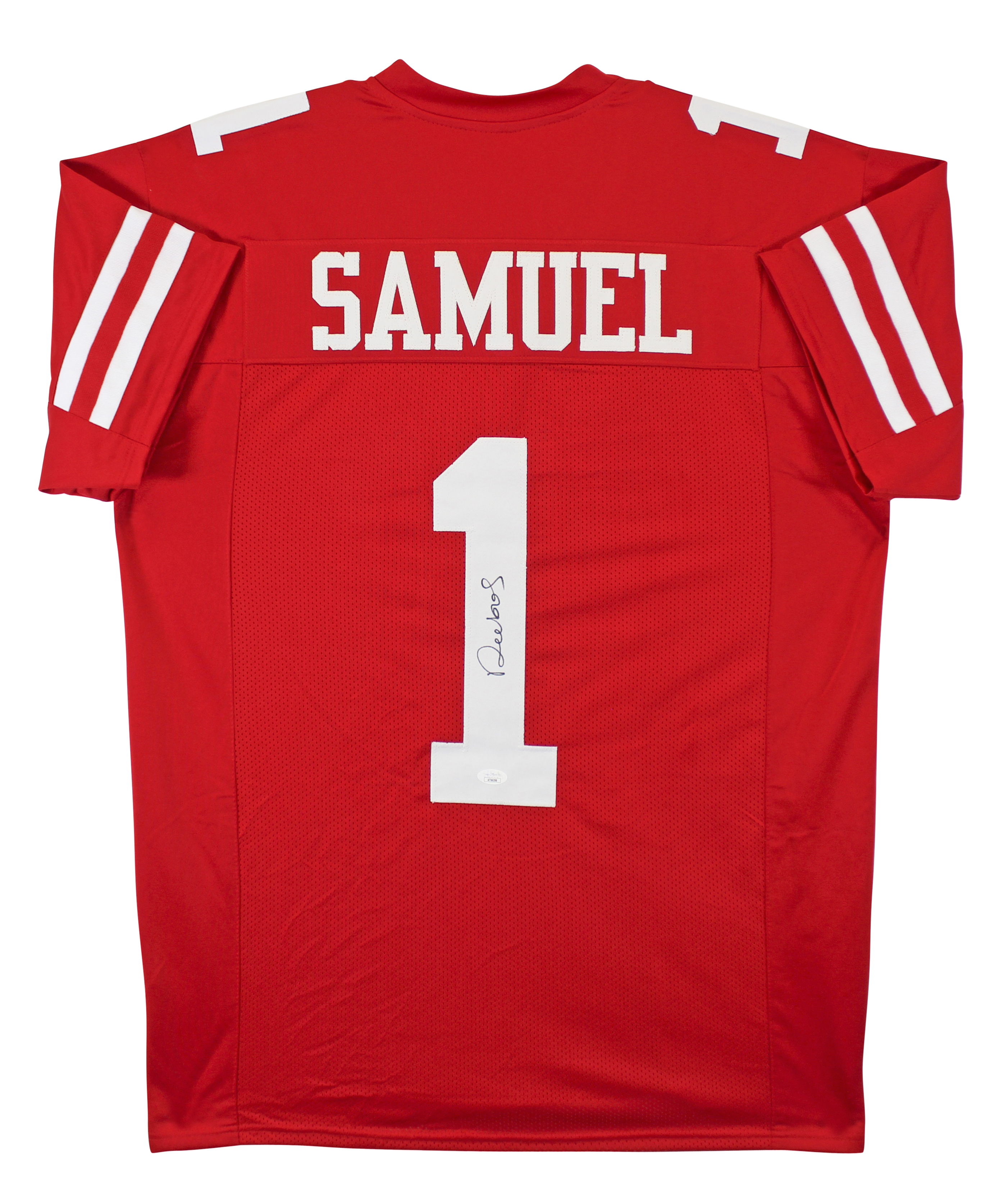 This Autographed Red Pro Style Jersey has been Personally Signed by Deebo Samuel of the San Francisco 49ers. This item is 100% Authentic to include a Certificate of Authenticity (COA) / hologram by JSA. We have multiples of this same item. While the photographs are representative of this item, the size, placement and strength of the signature may vary. Each item is hand signed, therefore, each autograph is unique. This is a X-Large sized, non-branded, custom-stitched Jersey. There is some staining / color transfer along with some dirt transfers on these jerseys. Please refer to photos prior to purchase.