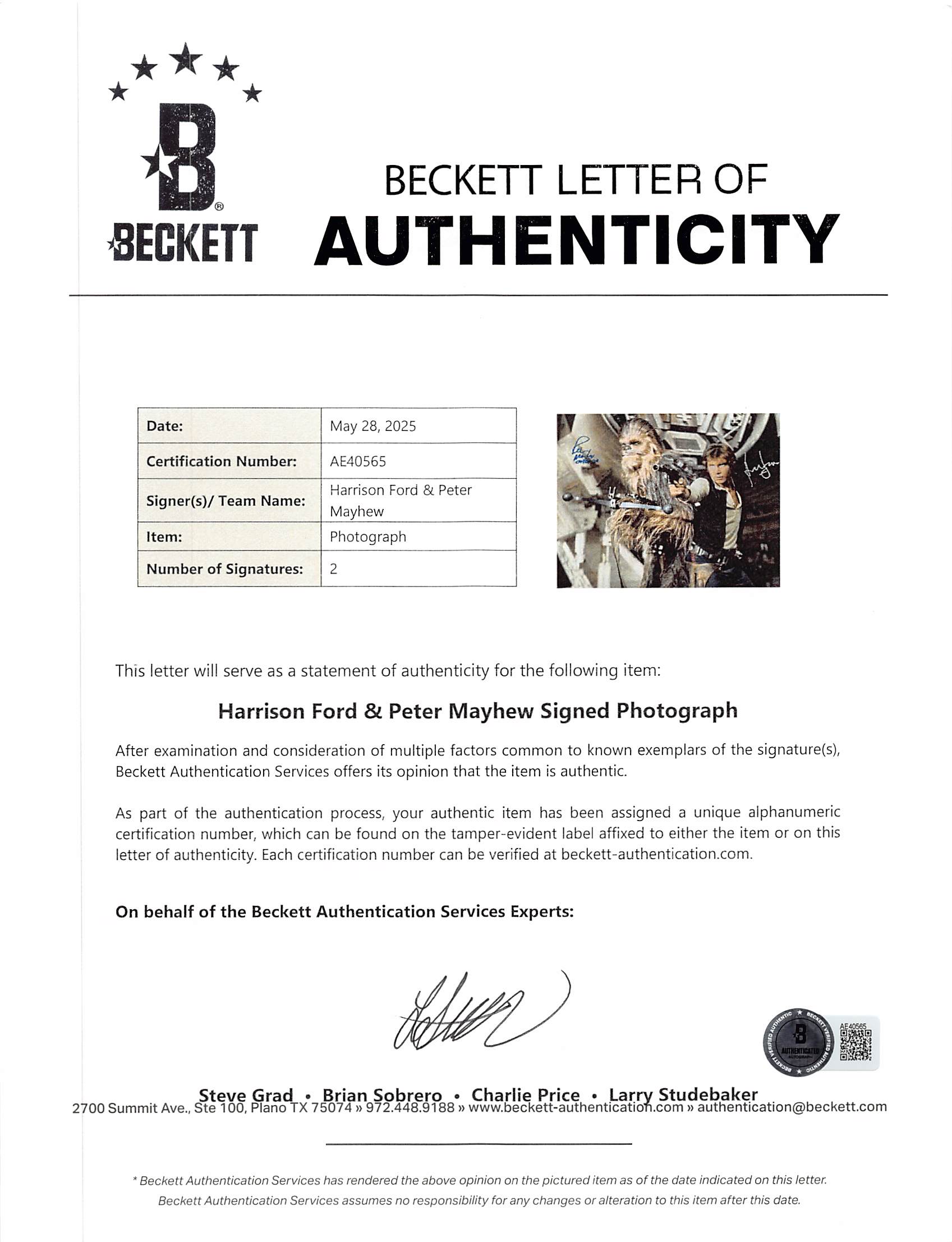 This Autographed 16x20 Framed Photo has been Personally Signed by Harrison Ford & Peter Mayhew of Star Wars. This item is 100% Authentic to include a Certificate of Authenticity (COA) / hologram by Beckett Authentication Services. The authenticity can be verified on Beckett Authentication Services website. This item has been professionally framed to overall dimensions of approximately 41.5 x 29.5 inches.