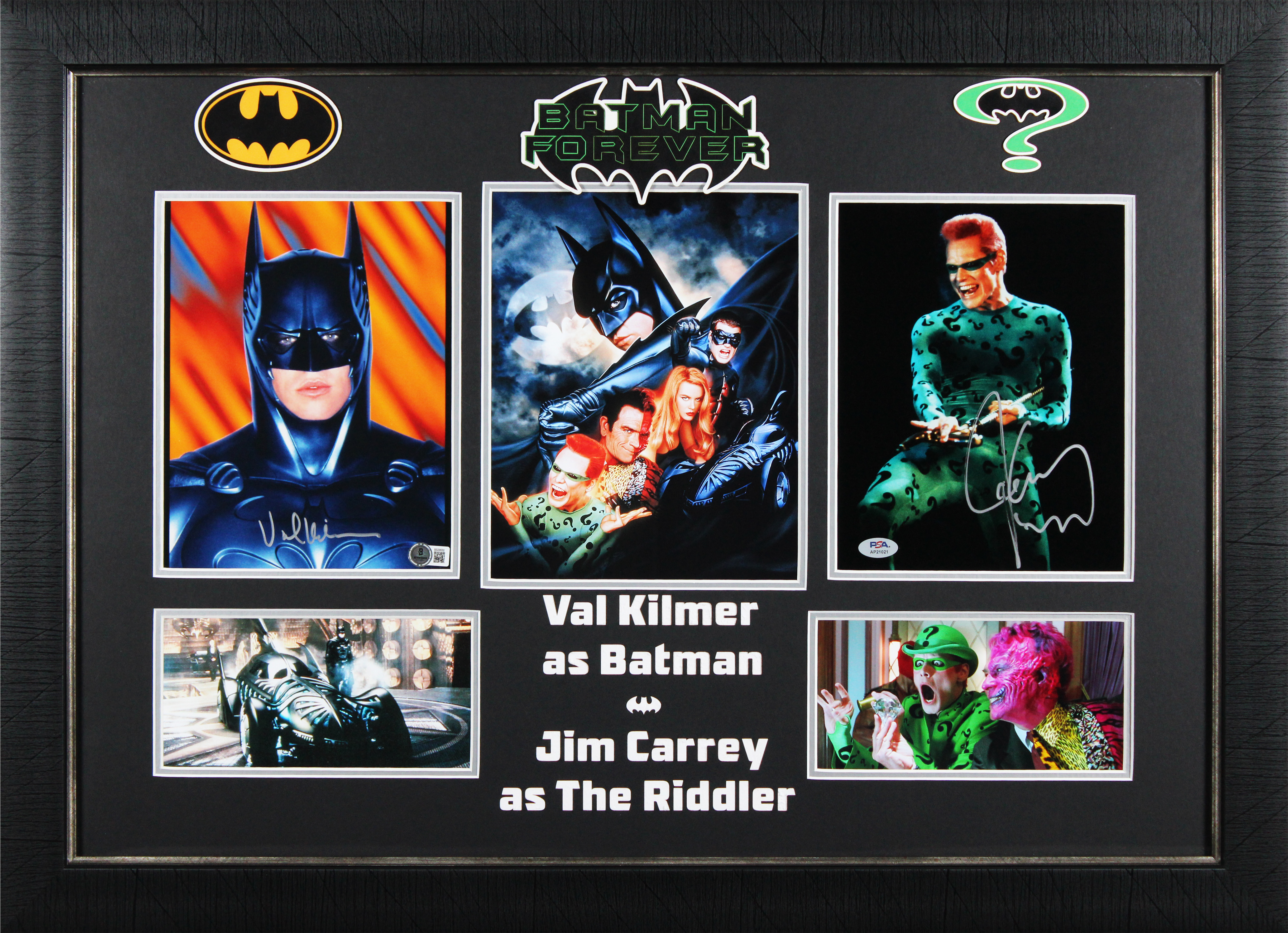 This Autographed 8x10 Photo Framed Display has been Personally Signed by Val Kilmer & Jim Carrey of Batman Forever. This item is 100% Authentic to include a hologram by Beckett Authentication Services for the Val Kilmer Signature. This item will come with an affixed Beckett Authentication Services (BAS) authentication sticker, which includes a scannable QR code to verify authenticity. Please note that Beckett no longer provides serial-numbered COA cards, and the attached BAS sticker will serve as the complete authentication for that item. The Jim Carrey signature is authenticated by PSA/DNA, it has a numbered hologram, PSA no longer provides a matching numbered COA. The authenticity can verified on PSA's site. The authenticity can be verified on Beckett Authentication Services website. This item has been professionally framed to overall dimensions of approximately 23.5 x 32.5 inches. There is handling wear throughout this photo, please reach out with questions prior to purchase.