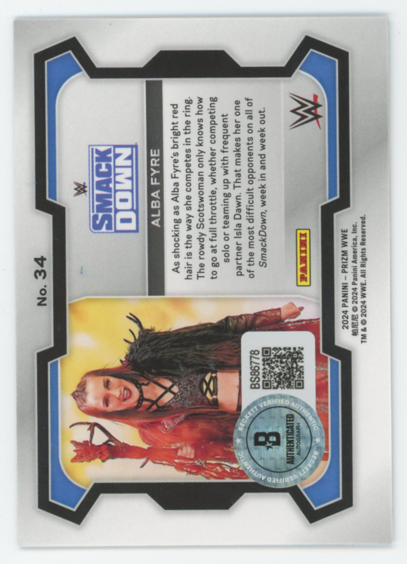 This Autographed 2024 Panini Prizm #34 Card has been Personally Signed by Alba Fyre of the World Wrestling Entertainment. This item is 100% Authentic to include a hologram by Beckett Authentication Services. This item will come with an affixed Beckett Authentication Services (BAS) authentication sticker, which includes a scannable QR code to verify authenticity. Please note that Beckett no longer provides serial-numbered COA cards, and the attached BAS sticker will serve as the complete authentication for this item. The authenticity can be verified on Beckett Authentication Services website.