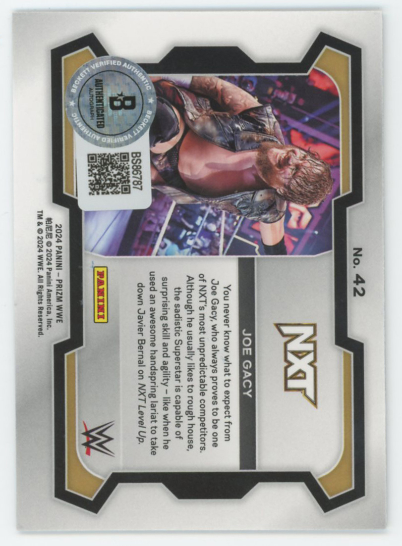 This Autographed 2024 Panini Prizm #42 Card has been Personally Signed by Joe Gacy of the World Wrestling Entertainment. This item is 100% Authentic to include a hologram by Beckett Authentication Services. This item will come with an affixed Beckett Authentication Services (BAS) authentication sticker, which includes a scannable QR code to verify authenticity. Please note that Beckett no longer provides serial-numbered COA cards, and the attached BAS sticker will serve as the complete authentication for this item. The authenticity can be verified on Beckett Authentication Services website.