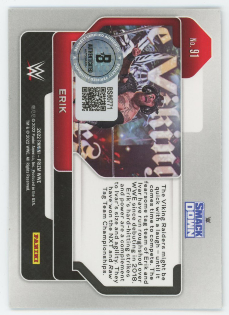 This Autographed 2022 Panini Prizm #91 Card has been Personally Signed by Erik of the World Wrestling Entertainment. This item is 100% Authentic to include a hologram by Beckett Authentication Services. This item will come with an affixed Beckett Authentication Services (BAS) authentication sticker, which includes a scannable QR code to verify authenticity. Please note that Beckett no longer provides serial-numbered COA cards, and the attached BAS sticker will serve as the complete authentication for this item. The authenticity can be verified on Beckett Authentication Services website.