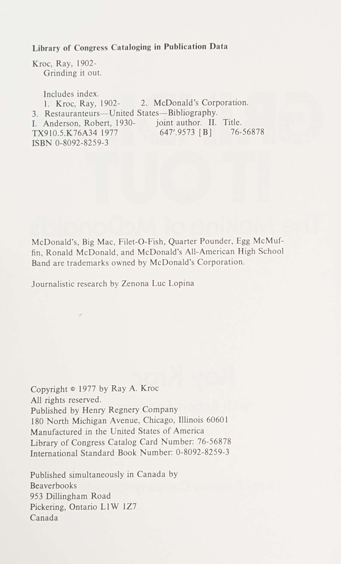 This Autographed Grinding It Out: The Making of McDonald's Hard Cover Book has been Personally Signed by Ray Kroc of McDonald's. This item is 100% Authentic to include a Certificate of Authenticity (COA) / hologram by Beckett Authentication Services. The authenticity can be verified on Beckett Authentication Services website.