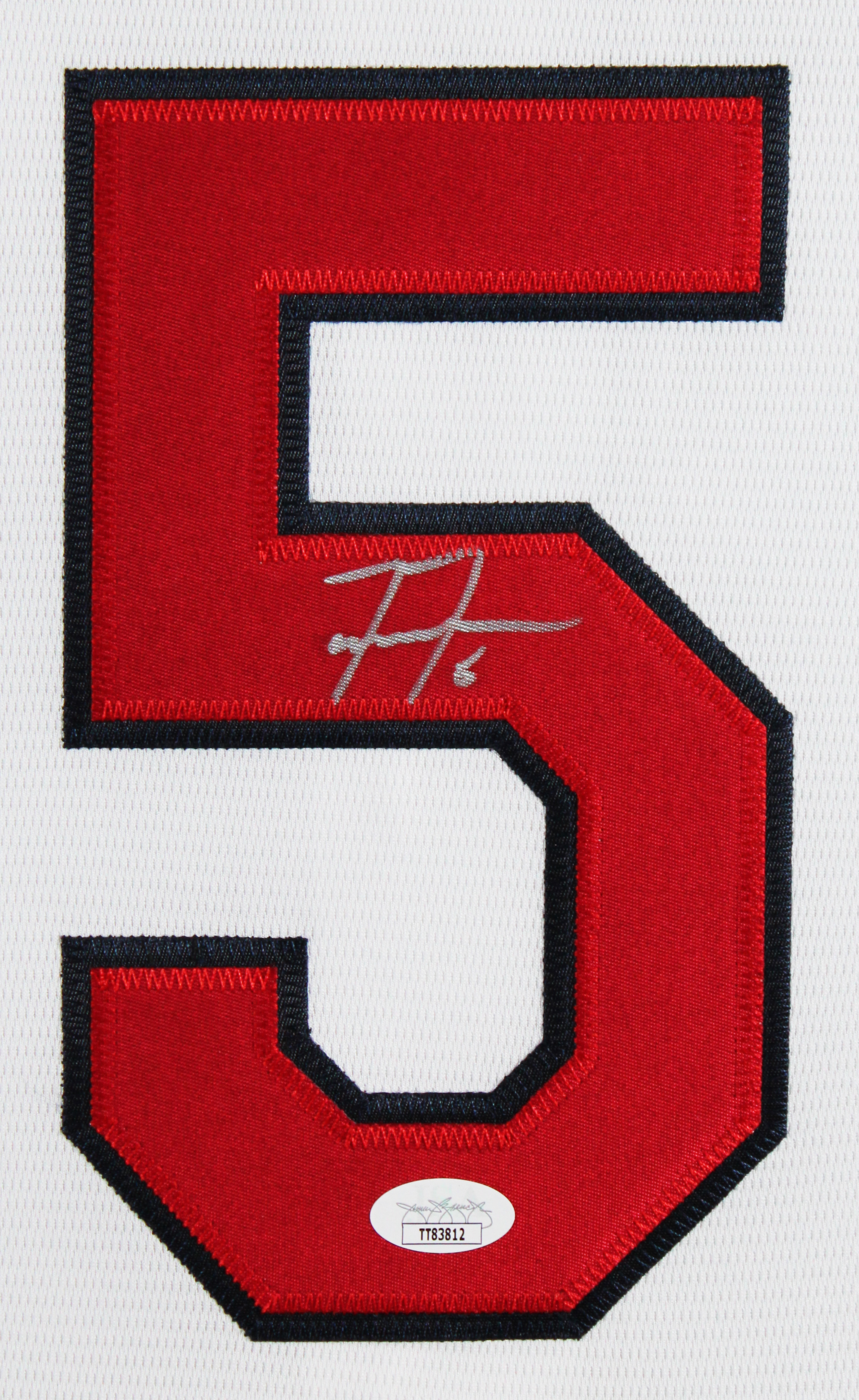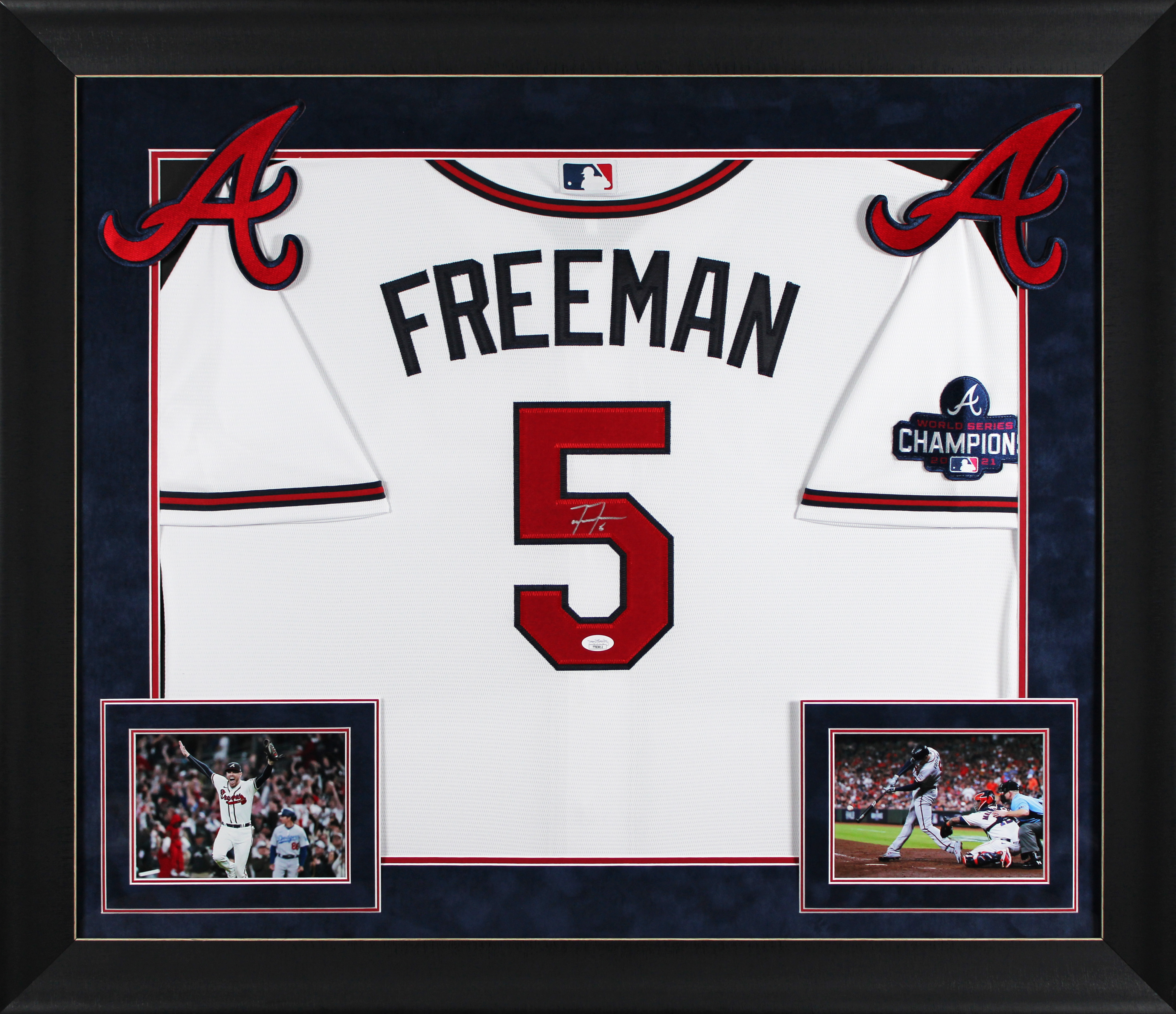 This Autographed w/ 2021 World Series Patch White Nike Framed Jersey has been Personally Signed by Freddie Freeman of the Atlanta Braves. This item is 100% Authentic to include a Certificate of Authenticity (COA) / hologram by JSA. We conducted an autograph signing with Freddie Freeman where multiples of the same item were signed. While the photographs are representative of this item, the size, placement and strength of the signature may vary. Each item is hand signed, therefore, each autograph is unique. This item can be verified through JSA. This item has been professionally framed to overall dimensions of approximately 32 x 37 inches. This is a X-Large sized Framed Jersey. This jersey will be framed to order, it will take approximately 3-4 business days from purchase date for it to ship.