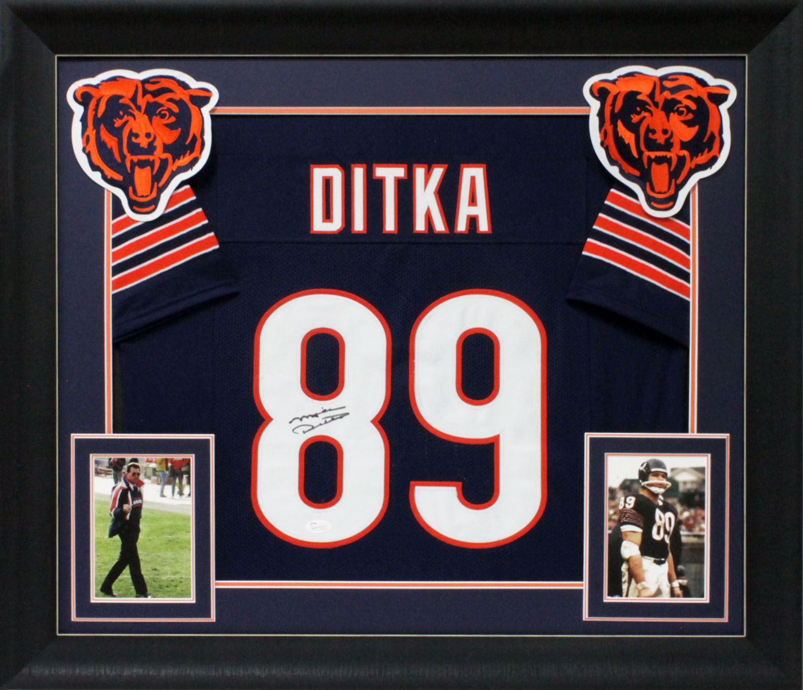 This Autographed Navy Blue Pro Style Framed Jersey has been Personally Signed by Mike Ditka of the Chicago Bears. This item is 100% Authentic to include a Certificate of Authenticity (COA) / hologram by JSA. We have multiples of this same item. While the photographs are representative of this item, the size, placement and strength of the signature may vary. Each item is hand signed, therefore, each autograph is unique. This item has been professionally framed to overall dimensions of approximately 32 x 37 inches. This is a X-Large sized, non-branded, custom-stitched Framed Jersey. This jersey will be framed to order, it will take approximately 3-4 business days from purchase date for it to ship.
