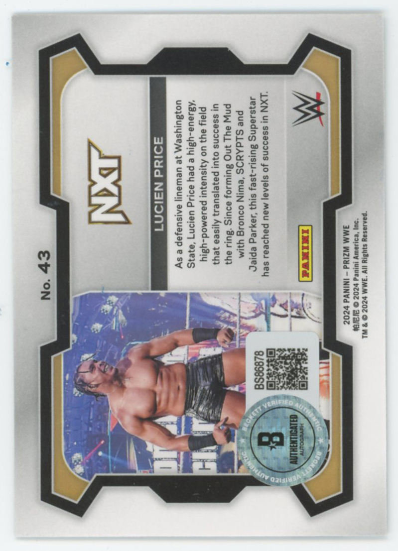 This Autographed 2024 Panini Prizm #43 Card has been Personally Signed by Lucien Price of the World Wrestling Entertainment. This item is 100% Authentic to include a hologram by Beckett Authentication Services. This item will come with an affixed Beckett Authentication Services (BAS) authentication sticker, which includes a scannable QR code to verify authenticity. Please note that Beckett no longer provides serial-numbered COA cards, and the attached BAS sticker will serve as the complete authentication for this item. The authenticity can be verified on Beckett Authentication Services website.