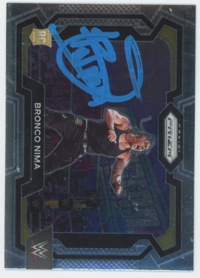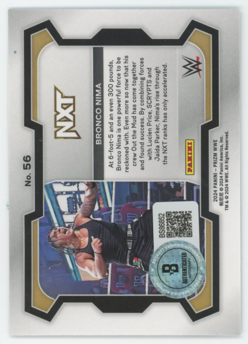 This Autographed 2024 Panini Prizm #56 Card has been Personally Signed by Bronco Nima of the World Wrestling Entertainment. This item is 100% Authentic to include a hologram by Beckett Authentication Services. This item will come with an affixed Beckett Authentication Services (BAS) authentication sticker, which includes a scannable QR code to verify authenticity. Please note that Beckett no longer provides serial-numbered COA cards, and the attached BAS sticker will serve as the complete authentication for this item. The authenticity can be verified on Beckett Authentication Services website.