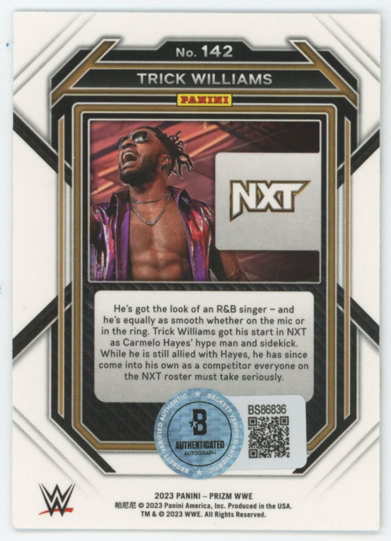 This Autographed 2023 Panini Prizm #142 Card has been Personally Signed by Trick Williams of the World Wrestling Entertainment. This item is 100% Authentic to include a hologram by Beckett Authentication Services. This item will come with an affixed Beckett Authentication Services (BAS) authentication sticker, which includes a scannable QR code to verify authenticity. Please note that Beckett no longer provides serial-numbered COA cards, and the attached BAS sticker will serve as the complete authentication for this item. The authenticity can be verified on Beckett Authentication Services website.