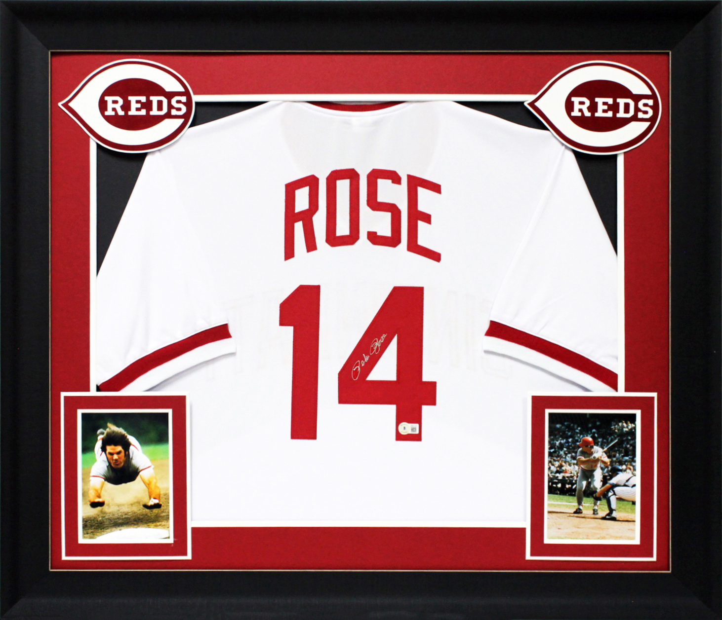 This Autographed White Pro Style Framed Jersey has been Personally Signed by Pete Rose of the Cincinnatti Reds. This item is 100% Authentic to include a hologram by Beckett Authentication Services. This item will come with an affixed Beckett Authentication Services (BAS) authentication sticker, which includes a scannable QR code to verify authenticity. Please note that Beckett no longer provides serial-numbered COA cards, and the attached BAS sticker will serve as the complete authentication for this item. We have multiples of this same item. While the photographs are representative of this item, the size, placement and strength of the signature may vary. Each item is hand signed, therefore, each autograph is unique. This item has been professionally framed to overall dimensions of approximately 32 x 37 inches. This is a X-Large sized, non-branded, custom-stitched Framed Jersey. This jersey will be framed to order, it will take approximately 3-4 business days from purchase date for it to ship.