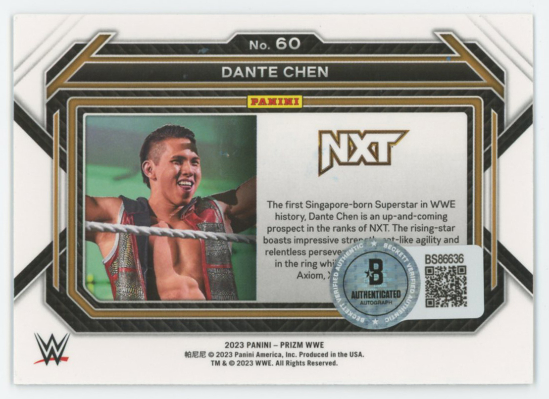 This Autographed 2023 Panini Prizm #60 Card has been Personally Signed by Dante Chen of the World Wrestling Entertainment. This item is 100% Authentic to include a hologram by Beckett Authentication Services. This item will come with an affixed Beckett Authentication Services (BAS) authentication sticker, which includes a scannable QR code to verify authenticity. Please note that Beckett no longer provides serial-numbered COA cards, and the attached BAS sticker will serve as the complete authentication for this item. The authenticity can be verified on Beckett Authentication Services website.