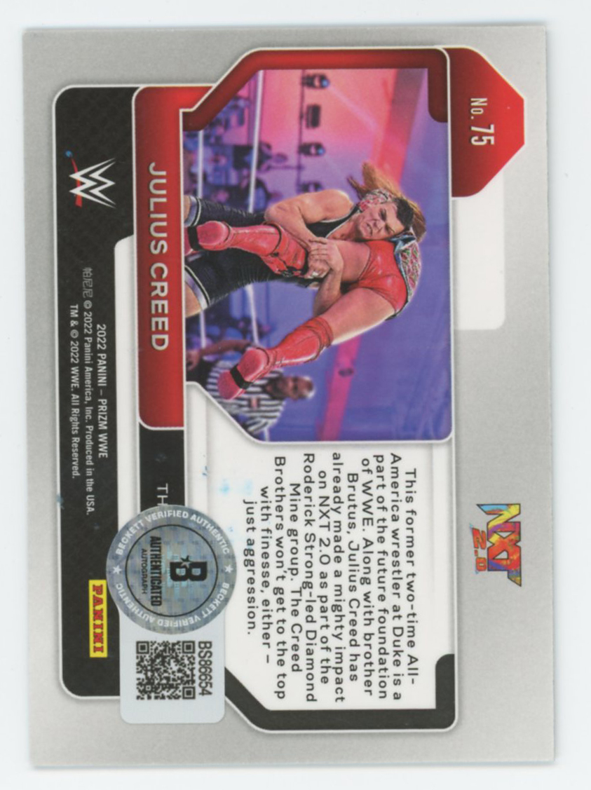This Autographed 2022 Panini Prizm #75 Card has been Personally Signed by Julius Creed of the World Wrestling Entertainment. This item is 100% Authentic to include a hologram by Beckett Authentication Services. This item will come with an affixed Beckett Authentication Services (BAS) authentication sticker, which includes a scannable QR code to verify authenticity. Please note that Beckett no longer provides serial-numbered COA cards, and the attached BAS sticker will serve as the complete authentication for this item. The authenticity can be verified on Beckett Authentication Services website.
