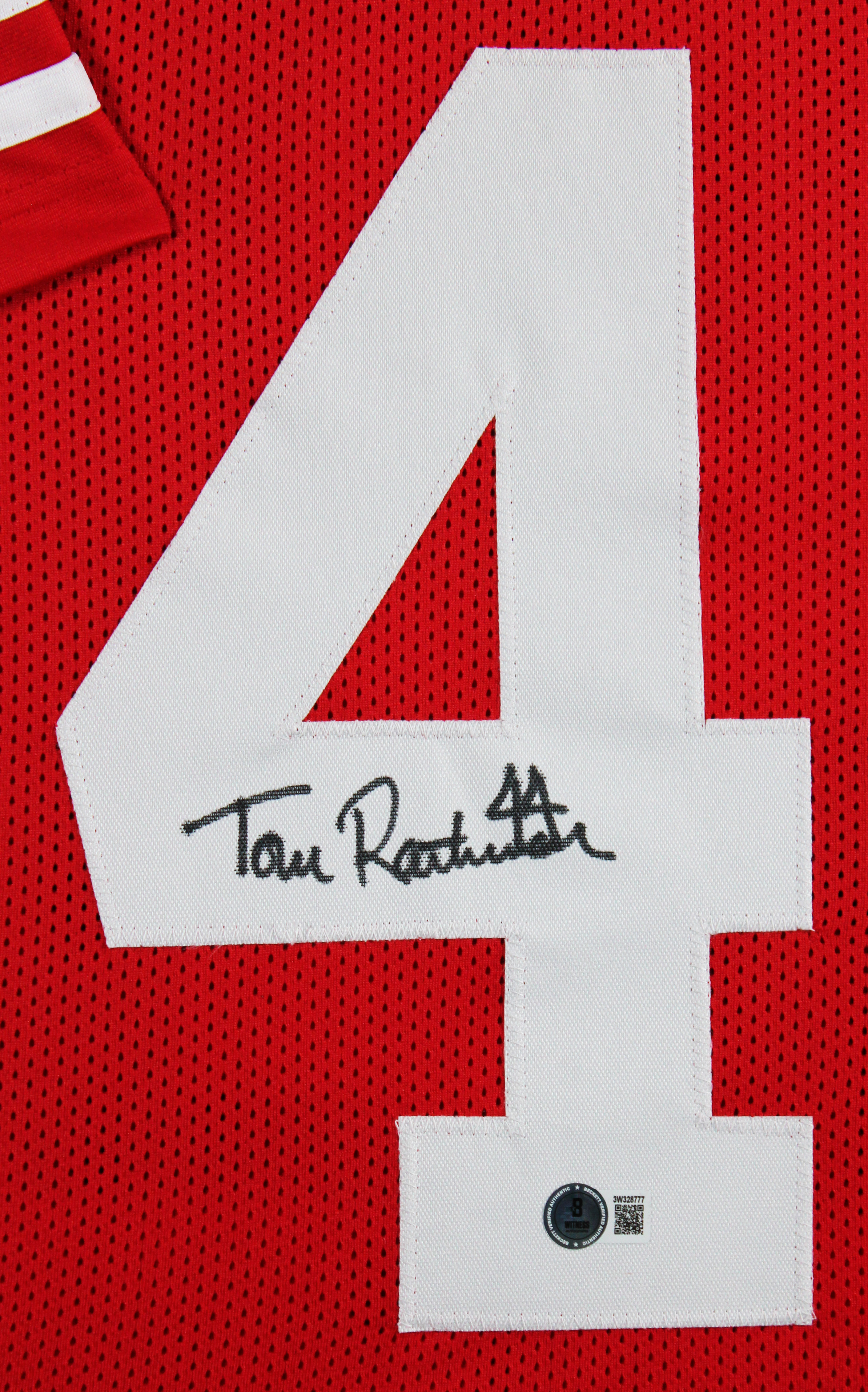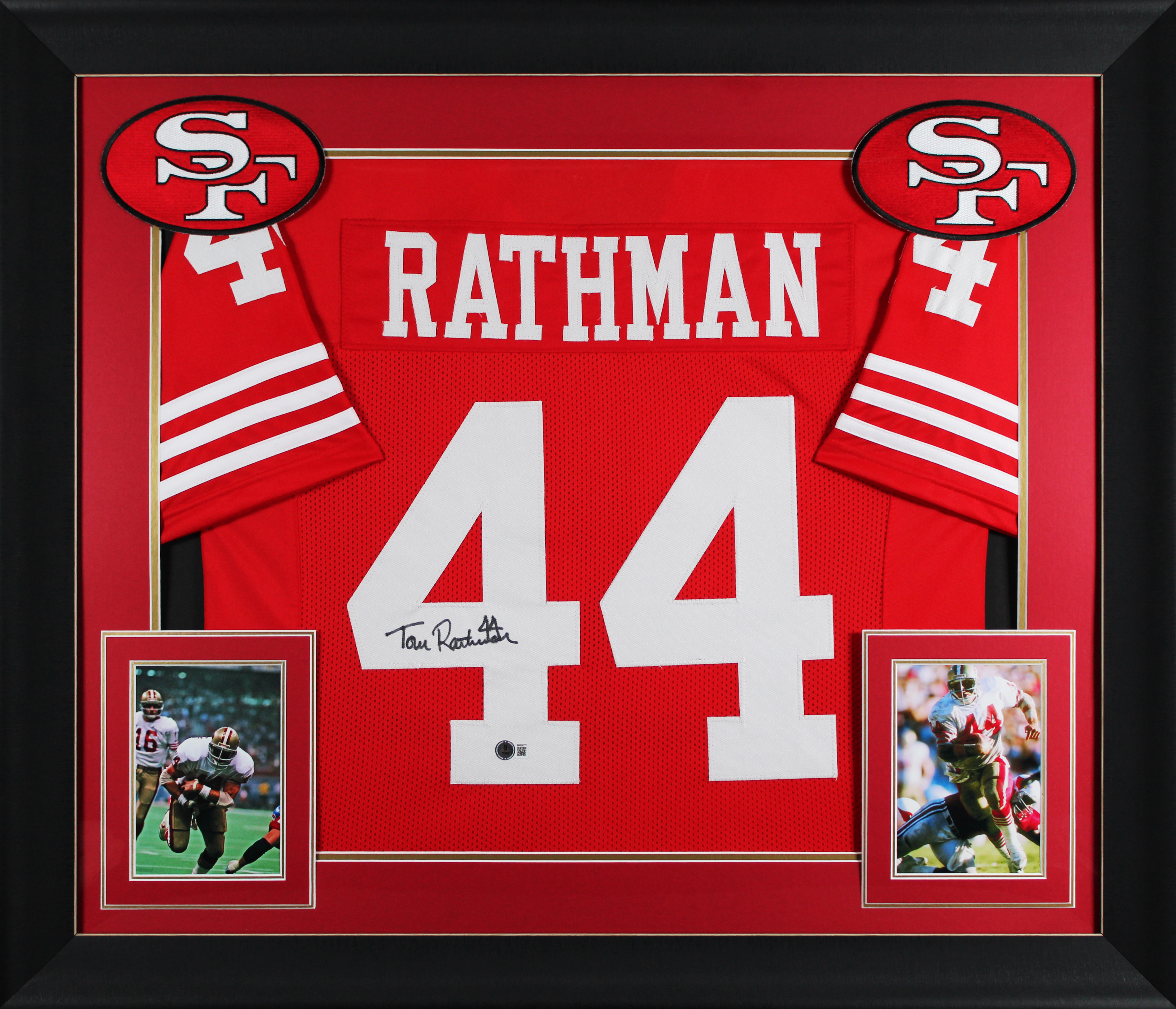 This Autographed Red Pro Style Framed Jersey has been Personally Signed by Tom Rathman of the San Francisco 49ers. This item is 100% Authentic to include a hologram by Beckett Authentication Services. This item will come with an affixed Beckett Authentication Services (BAS) authentication sticker, which includes a scannable QR code to verify authenticity. Please note that Beckett no longer provides serial-numbered COA cards, and the attached BAS sticker will serve as the complete authentication for this item. This is a BAS Witnessed Protection Program item which means a Beckett Authentication Service representative was present when this item was being signed. We conducted an autograph signing with Tom Rathman where multiples of the same item were signed. While the photographs are representative of this item, the size, placement and strength of the signature may vary. Each item is hand signed, therefore, each autograph is unique. This item can be verified through BAS Witnessed. This item has been professionally framed to overall dimensions of approximately 32 x 37 inches. This is a X-Large sized, non-branded, custom-stitched Framed Jersey. This jersey will be framed to order, it will take approximately 3-4 business days from purchase date for it to ship.