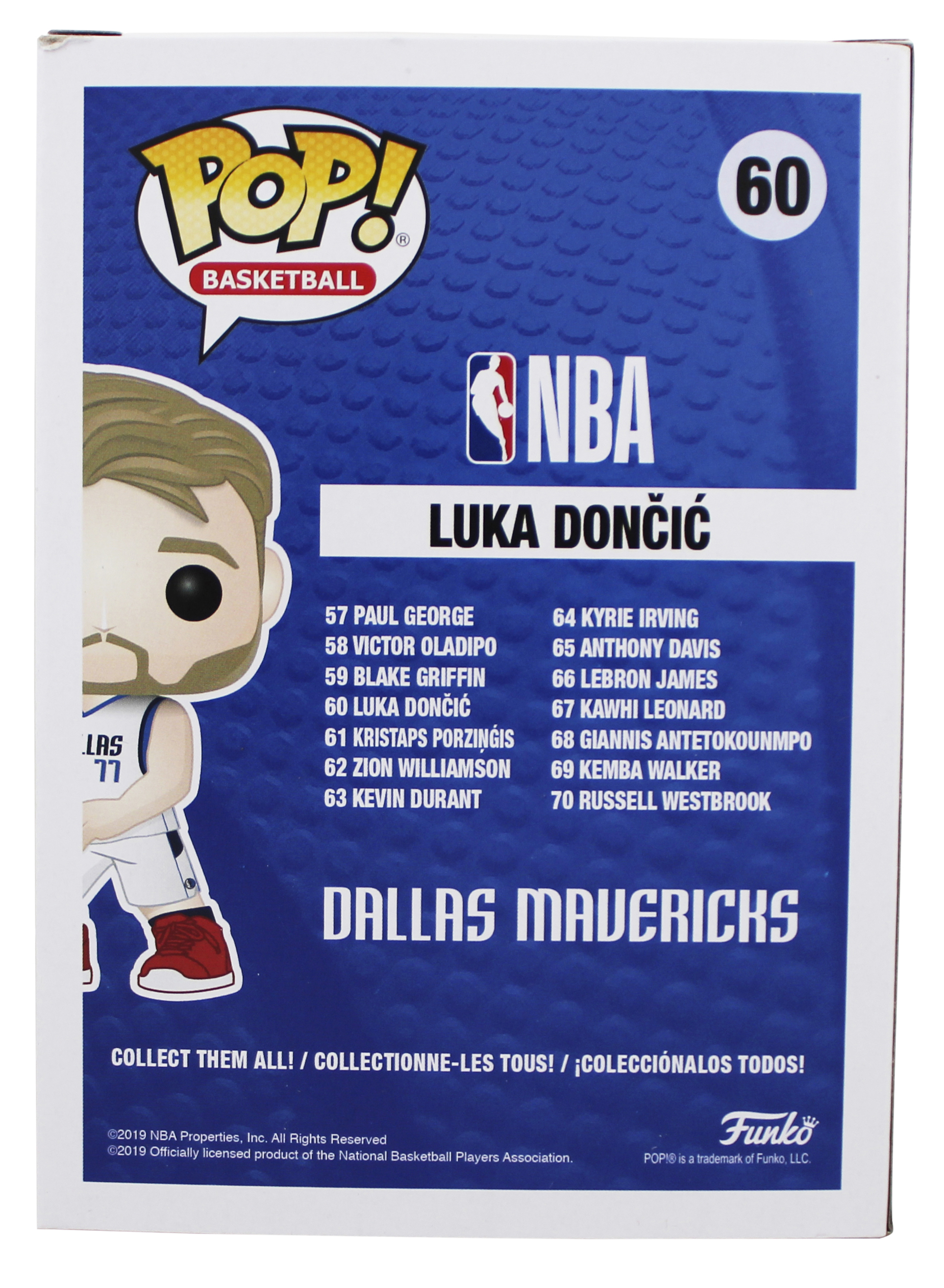 This Autographed #60 Funko Pop Vinyl Figure has been Personally Signed by Luka Doncic of the Dallas Mavericks. This item is 100% Authentic to include a Certificate of Authenticity (COA) / hologram by Beckett Authentication Services. The authenticity can be verified on Beckett Authentication Services website.