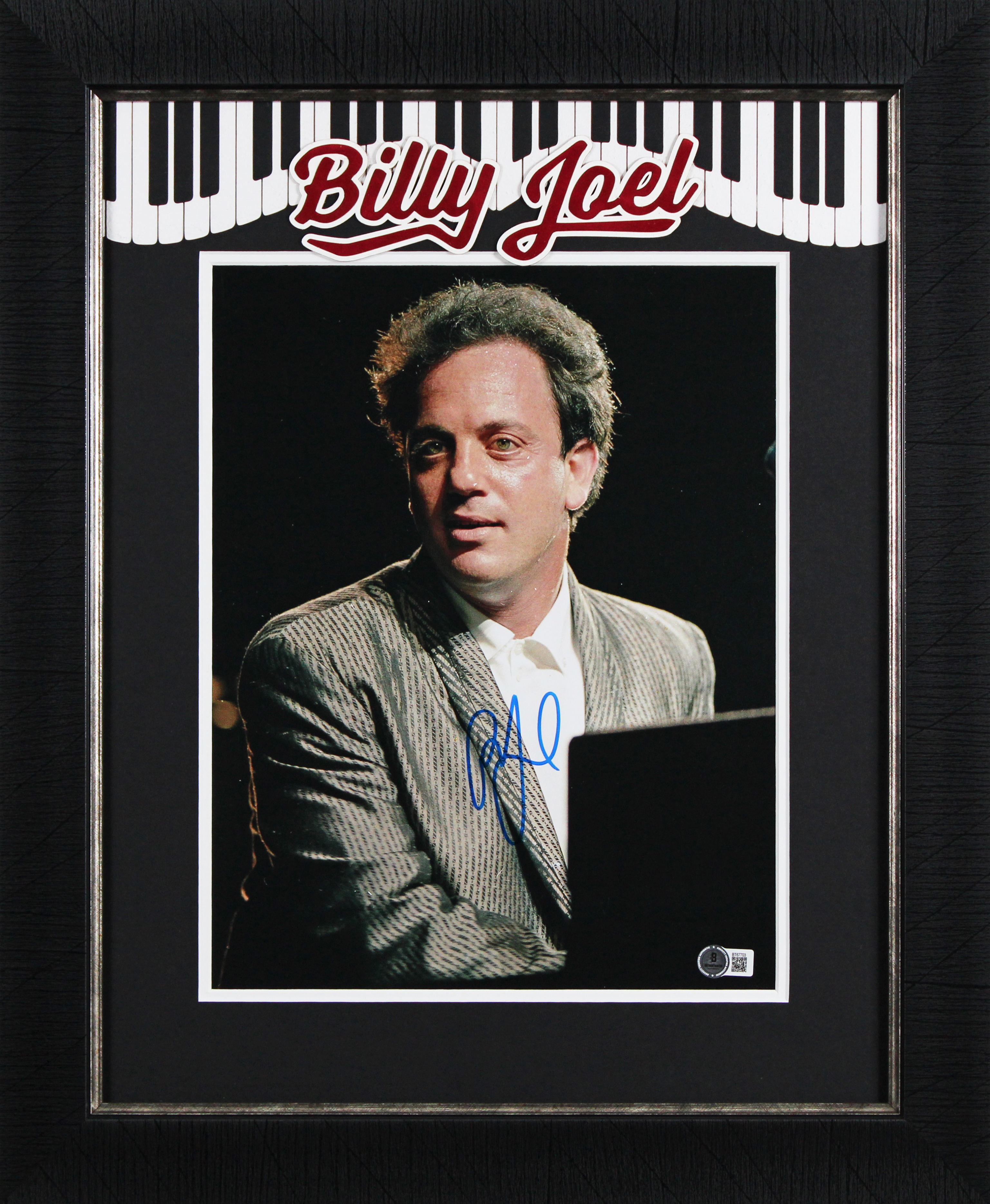This Autographed Vertical Piano Man 11x14 Framed Photo has been Personally Signed by Billy Joel. This item is 100% Authentic to include a hologram by Beckett Authentication Services. This item will come with an affixed Beckett Authentication Services (BAS) authentication sticker, which includes a scannable QR code to verify authenticity. Please note that Beckett no longer provides serial-numbered COA cards, and the attached BAS sticker will serve as the complete authentication for this item. The authenticity can be verified on Beckett Authentication Services website. This item has been professionally framed to overall dimensions of approximately 18.5 x 22.5 inches.