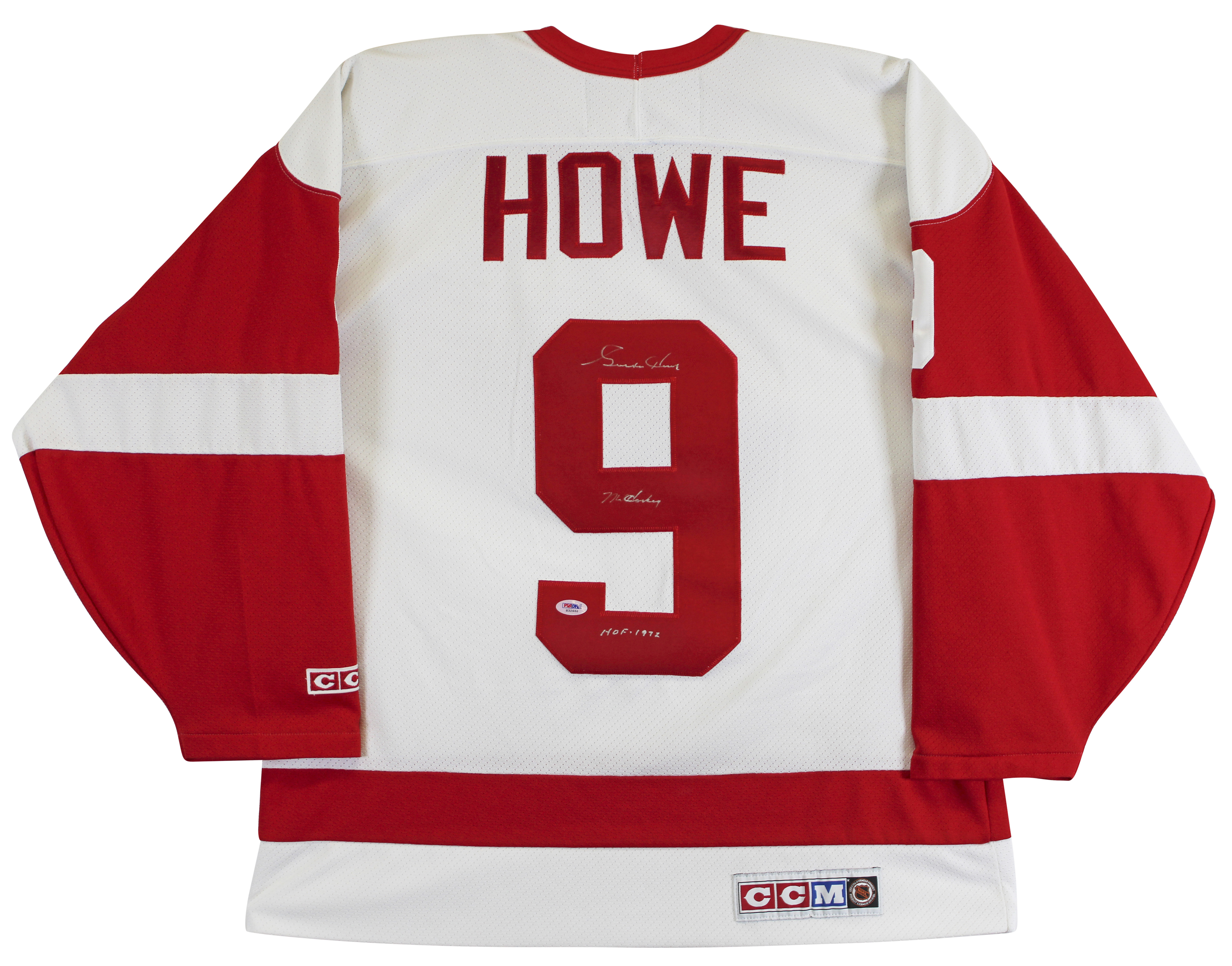 This Autographed White CCM Jersey with the inscription of "Mr. Hockey, HOF 1972" has been Personally Signed by Gordie Howe of the Detroit Red Wings. This item is 100% Authentic and comes with a PSA/DNA Certification Card and a matching numbered Hologram. The authenticity can be verified on Professional Sports Authenticator website. This is a Large sized Jersey.