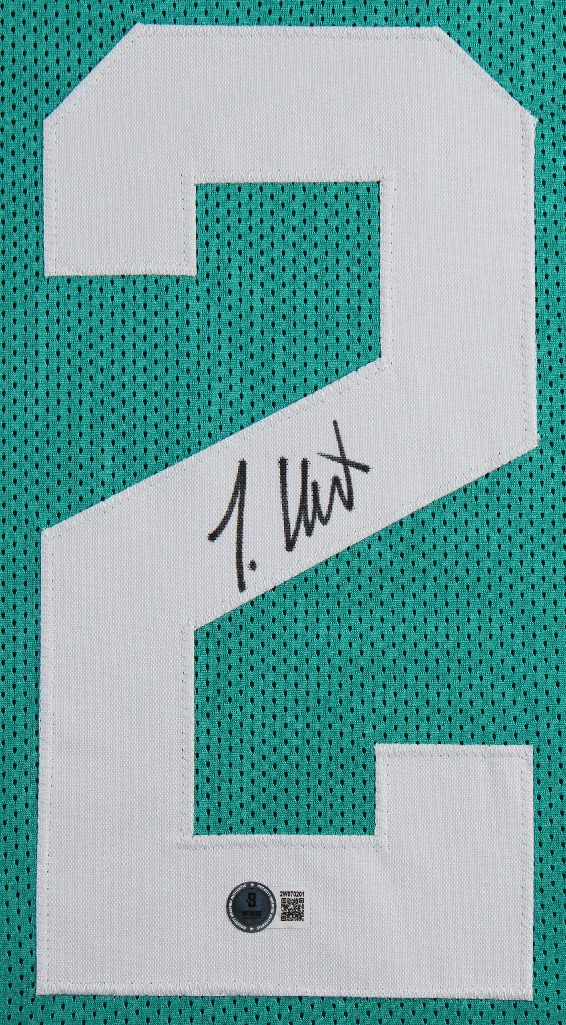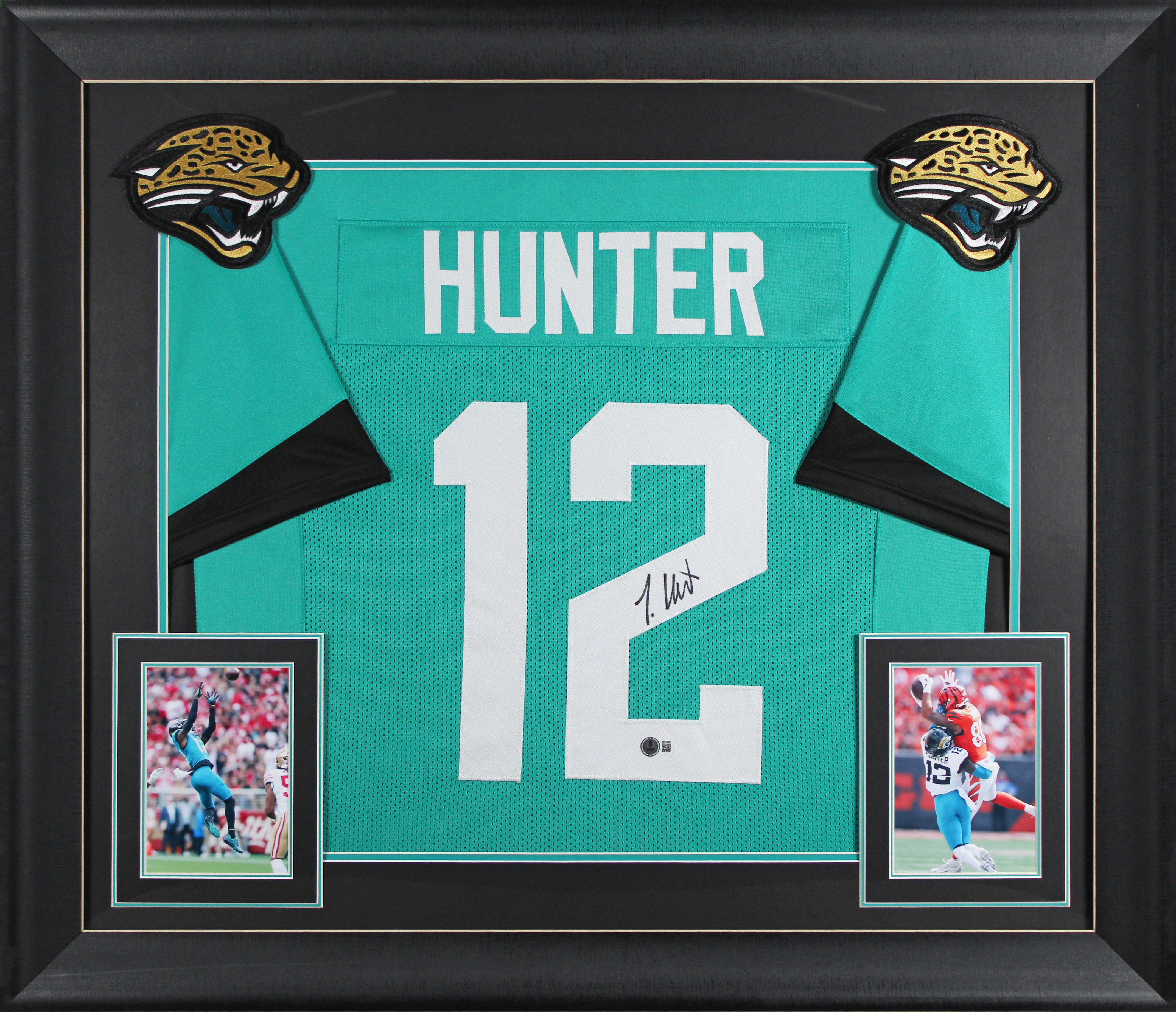 This Autographed Teal Pro Style Jersey has been Personally Signed by Travis Hunter of the Jacksonville Jaguars. This item is 100% Authentic to include a hologram by Beckett Authentication Services. This item will come with an affixed Beckett Authentication Services (BAS) authentication sticker, which includes a scannable QR code to verify authenticity. Please note that Beckett no longer provides serial-numbered COA cards, and the attached BAS sticker will serve as the complete authentication for this item. This is a BAS Witnessed Protection Program item which means a Beckett Authentication Service representative was present when this item was being signed. We conducted an autograph signing with Travis Hunter where multiples of the same item were signed. While the photographs are representative of this item, the size, placement and strength of the signature may vary. Each item is hand signed, therefore, each autograph is unique. This item can be verified through BAS Witnessed. This is a X-Large sized, non-branded, custom-stitched Jersey. This jersey will be framed to order, it will take approximately 3-4 business days from purchase date for it to ship.