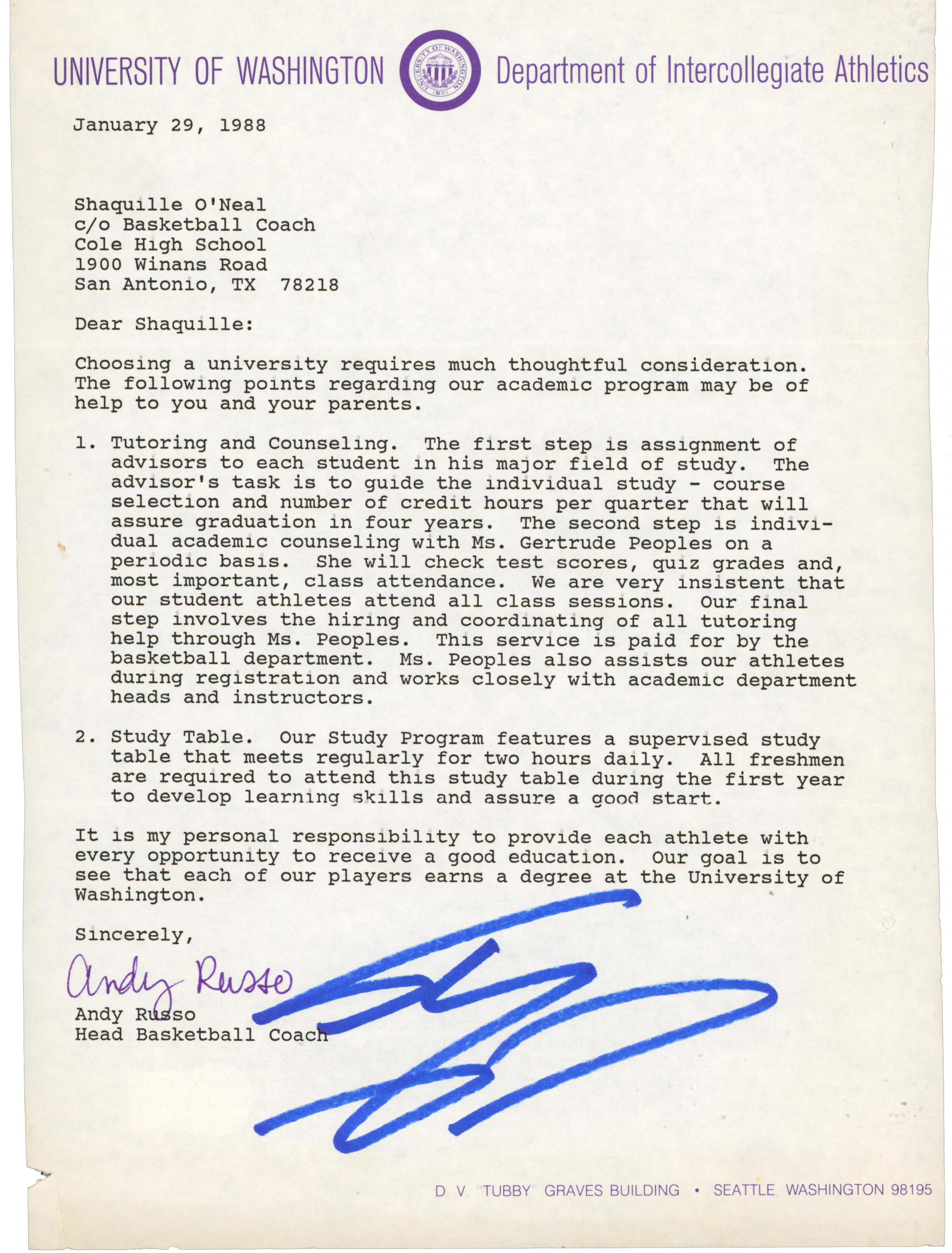 This is a 1988 University of Washington Shaquille O'Neal Recruitment Letter has been written to Shaquille O'Neal. This recruitment letter was signed by Andy Russo, the Head Basketball Coach of University of Washington as well as Shaquille O'Neal. Russo's signature is not authenticated. This recruitment letter will come with a Letter of Authenticity from Shaquille O'Neal, which has been signed in the presence of a Beckett representative. This letter was was kept in Shaquille O'Neal's personal collection since it was received.