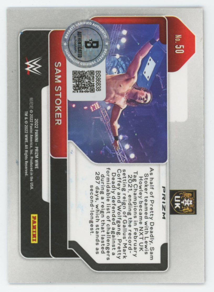 This Autographed 2022 Panini Prizm #50 Rookie Card has been Personally Signed by Sam Stoker of the World Wrestling Entertainment. This item is 100% Authentic to include a hologram by Beckett Authentication Services. This item will come with an affixed Beckett Authentication Services (BAS) authentication sticker, which includes a scannable QR code to verify authenticity. Please note that Beckett no longer provides serial-numbered COA cards, and the attached BAS sticker will serve as the complete authentication for this item. The authenticity can be verified on Beckett Authentication Services website.