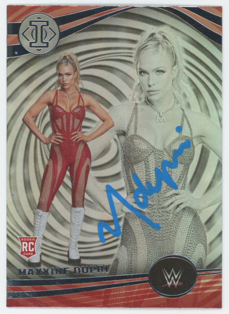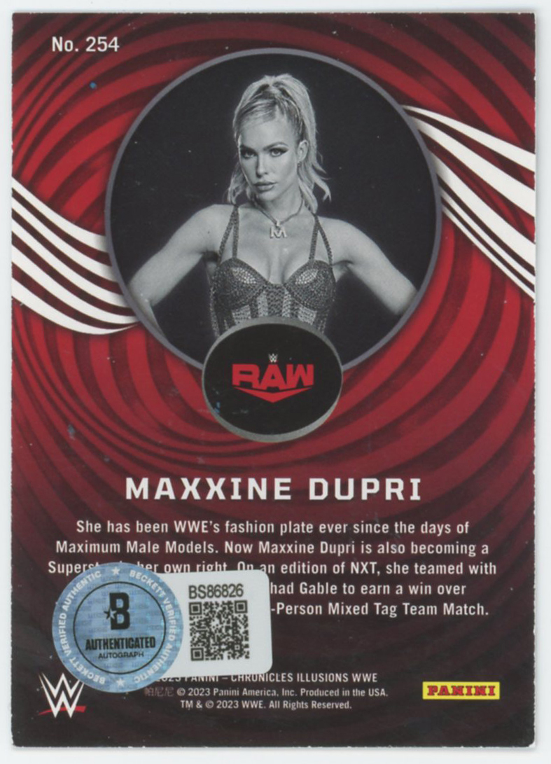 This Autographed 2023 Panini Chronicles #254 Rookie Card has been Personally Signed by Maxxine Dupri of the World Wrestling Entertainment. This item is 100% Authentic to include a hologram by Beckett Authentication Services. This item will come with an affixed Beckett Authentication Services (BAS) authentication sticker, which includes a scannable QR code to verify authenticity. Please note that Beckett no longer provides serial-numbered COA cards, and the attached BAS sticker will serve as the complete authentication for this item. The authenticity can be verified on Beckett Authentication Services website.