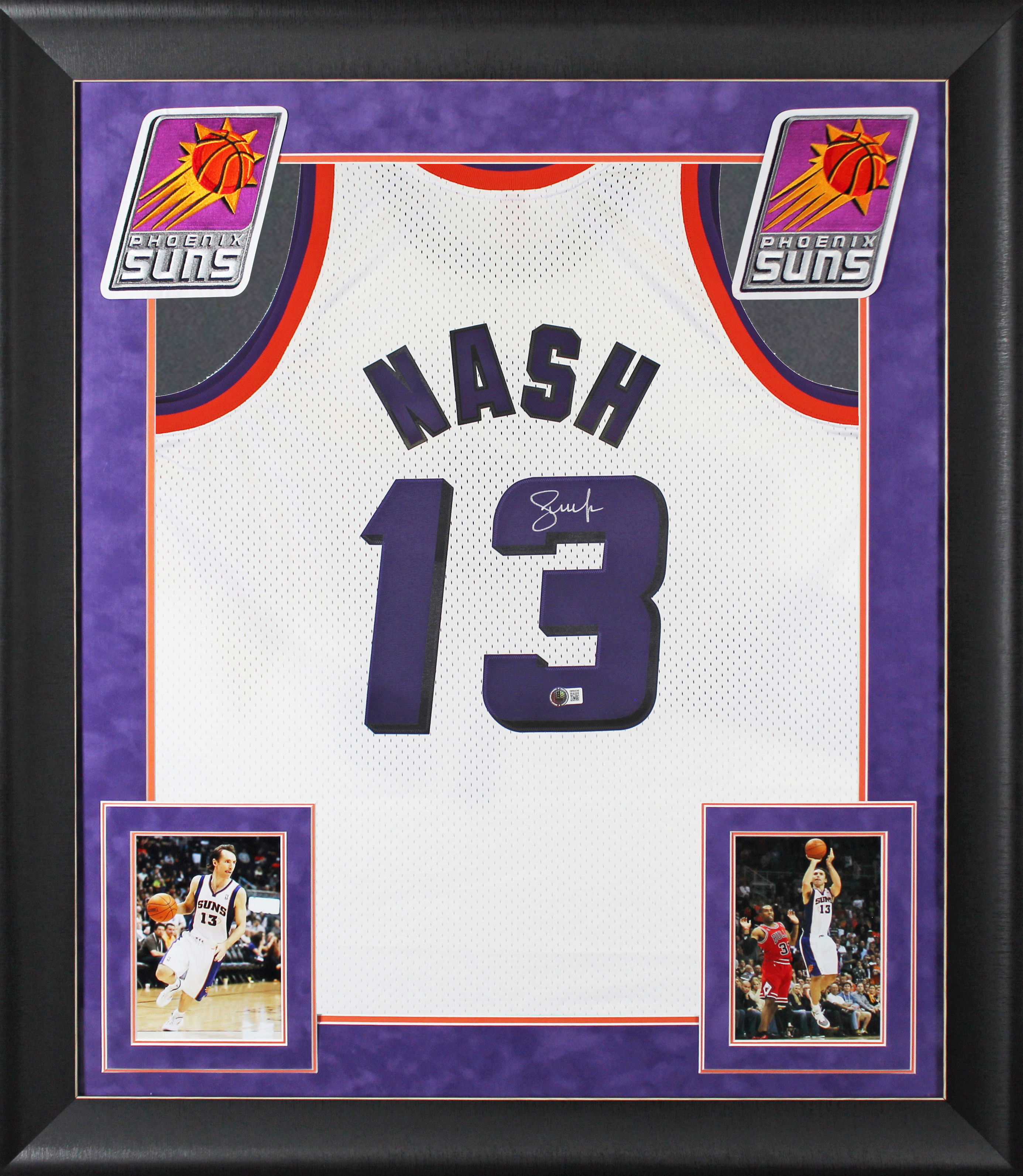This Autographed White Mitchell & Ness 1996-97 Hardwood Classics Swingman Framed Jersey has been Personally Signed by Steve Nash of the Phoenix Suns. This item is 100% Authentic to include a hologram by Beckett Authentication Services. This item will come with an affixed Beckett Authentication Services (BAS) authentication sticker, which includes a scannable QR code to verify authenticity. Please note that Beckett no longer provides serial-numbered COA cards, and the attached BAS sticker will serve as the complete authentication for this item. This is a BAS Witnessed Protection Program item which means a Beckett Authentication Service representative was present when this item was being signed. We conducted an autograph signing with Steve Nash where multiples of the same item were signed. While the photographs are representative of this item, the size, placement and strength of the signature may vary. Each item is hand signed, therefore, each autograph is unique. This item can be verified through BAS Witnessed. This item has been professionally framed to overall dimensions of approximately 32 x 37 inches. This is a X-Large sized Framed Jersey. This jersey will be framed to order, it will take approximately 3-4 business days from purchase date for it to ship.