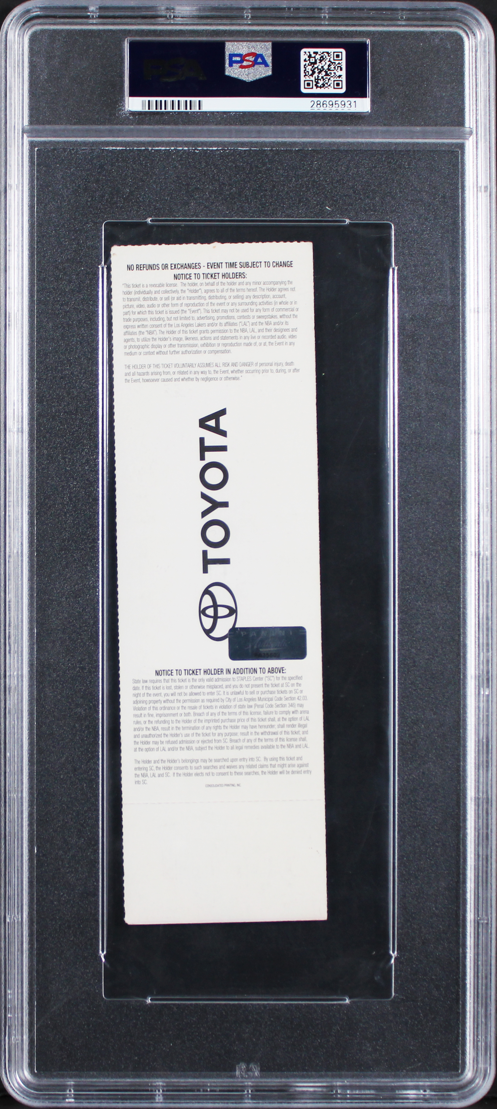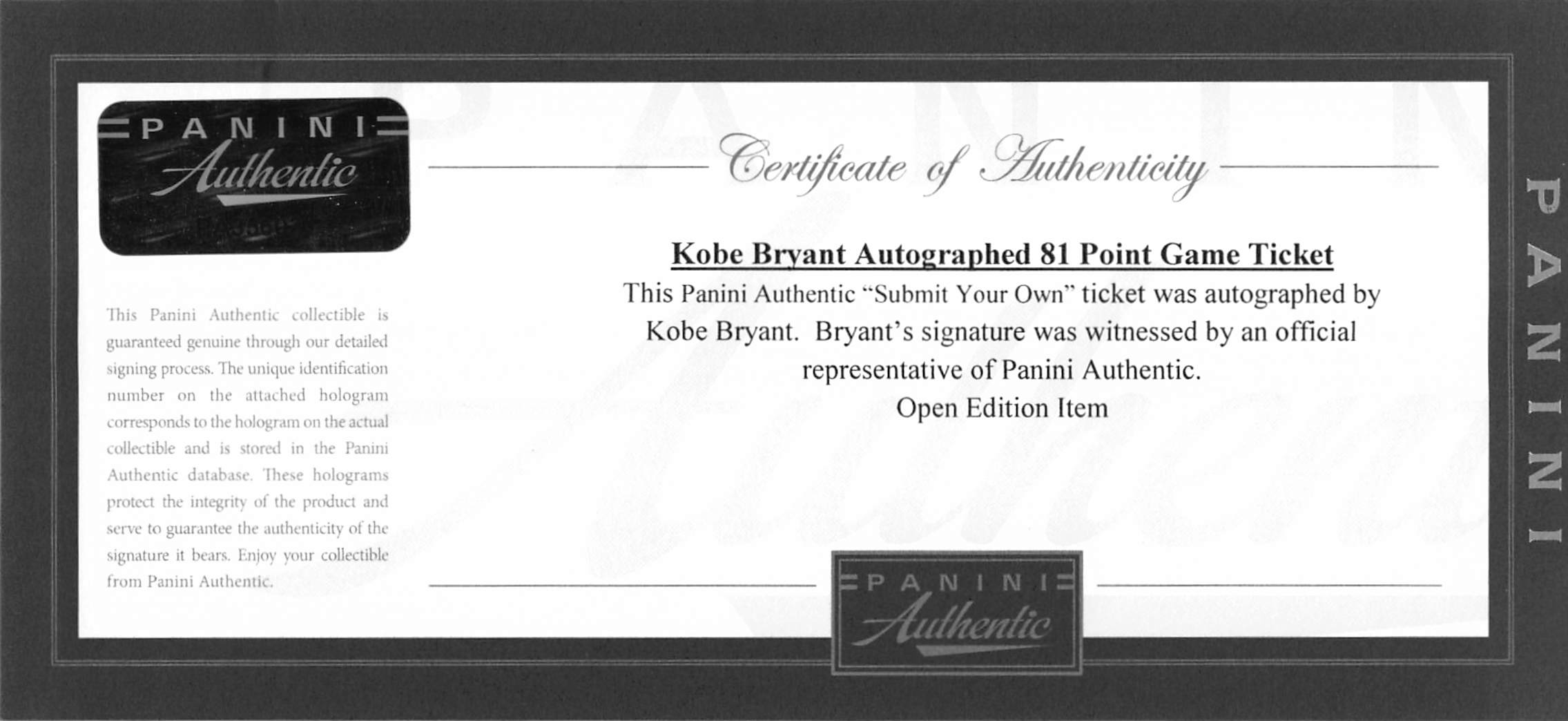 This Autographed January 22nd, 2006 Lakers Vs Raptors 81 Point Game Full Ticket Stub has been Personally Signed by Kobe Bryant of the Los Angeles Lakers. This item is 100% Authentic, it comes slabbed and authenticated by PSA/DNA. The authenticity can be verified on Professional Sports Authenticator website.