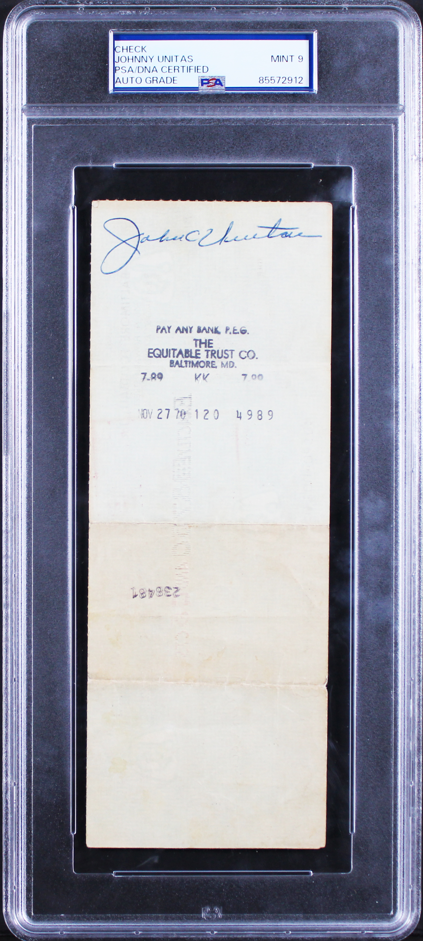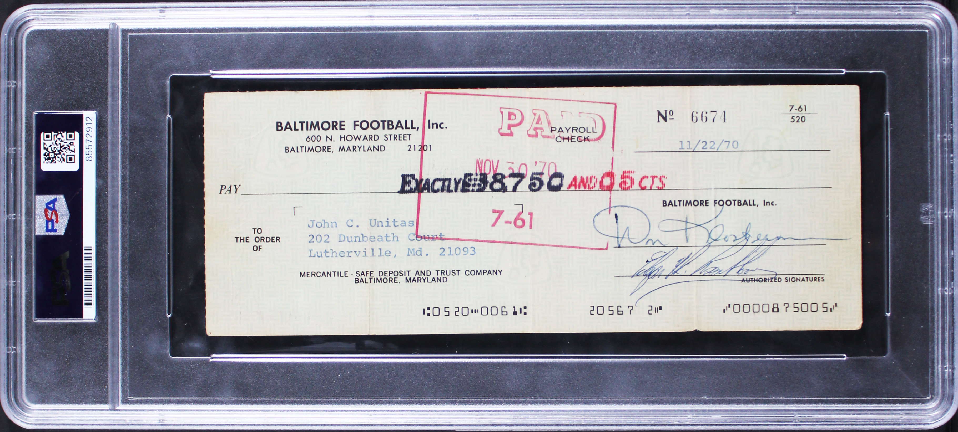This Autographed Dated November 22, 1970 Auto Graded Mint 9! Payroll Check has been Personally Signed by Johnny Unitas of the Baltimore Colts. This item is 100% Authentic, it comes slabbed and authenticated by PSA/DNA. The authenticity can be verified on Professional Sports Authenticator website.