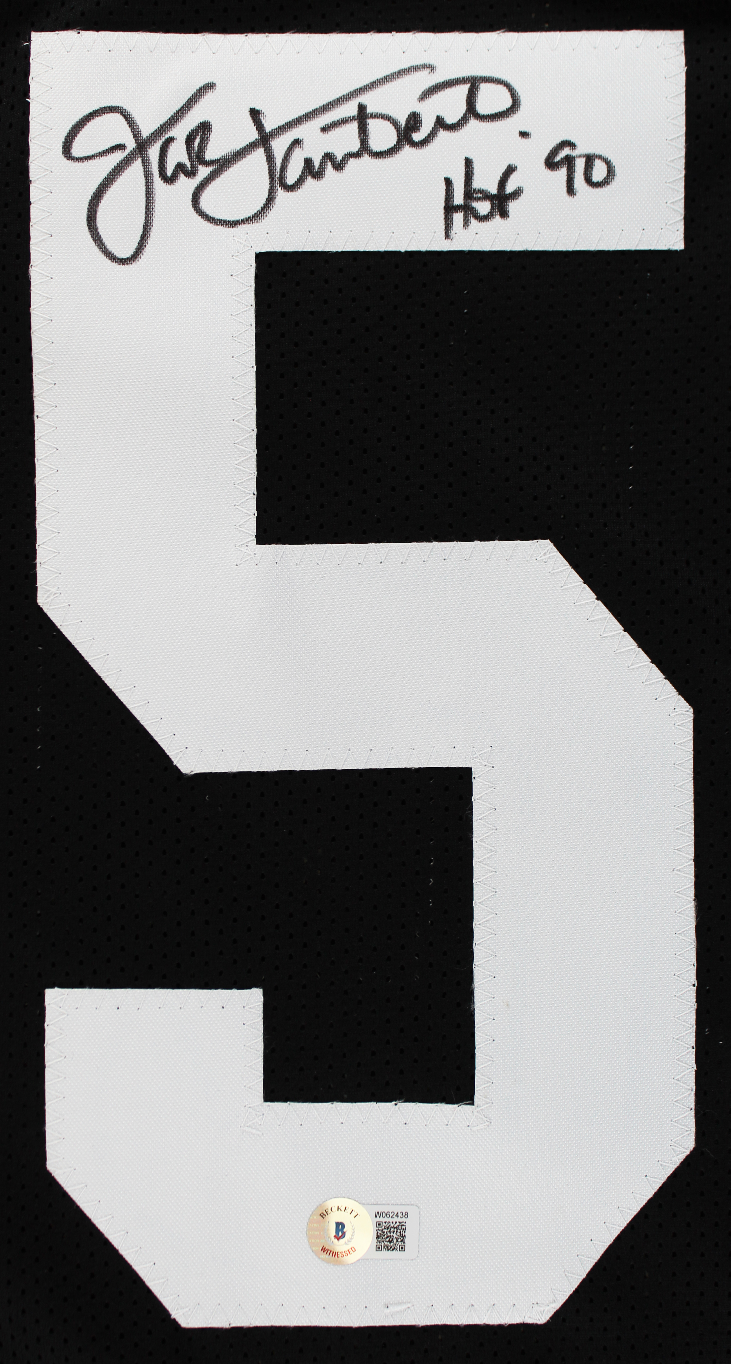 This Autographed Black Pro Style Framed Jersey with the inscription of "HOF 90" has been Personally Signed by Jack Lambert of the Pittsburgh Steelers. This item is 100% Authentic to include a hologram by Beckett Authentication Services. This item will come with an affixed Beckett Authentication Services (BAS) authentication sticker, which includes a scannable QR code to verify authenticity. Please note that Beckett no longer provides serial-numbered COA cards, and the attached BAS sticker will serve as the complete authentication for this item. This is a BAS Witnessed Protection Program item which means a Beckett Authentication Service representative was present when this item was being signed. We conducted an autograph signing with Jack Lambert where multiples of the same item were signed. While the photographs are representative of this item, the size, placement and strength of the signature may vary. Each item is hand signed, therefore, each autograph is unique. This item can be verified through BAS Witnessed. This item has been professionally framed to overall dimensions of approximately 32 x 37 inches. This is a X-Large sized, non-branded, custom-stitched Framed Jersey. This jersey will be framed to order, it will take approximately 3-4 business days from purchase date for it to ship.
