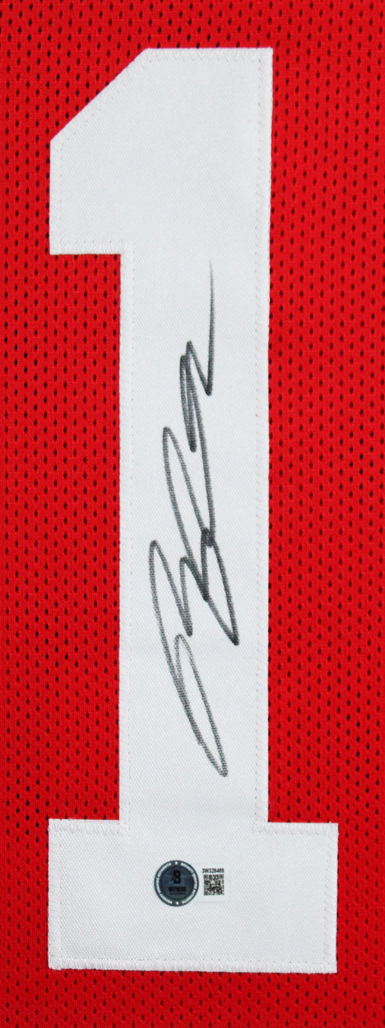 This Autographed Red Pro Style Framed Jersey has been Personally Signed by Ricky Pearsall of the San Francisco 49ers. This item is 100% Authentic to include a hologram by Beckett Authentication Services. This item will come with an affixed Beckett Authentication Services (BAS) authentication sticker, which includes a scannable QR code to verify authenticity. Please note that Beckett no longer provides serial-numbered COA cards, and the attached BAS sticker will serve as the complete authentication for this item. This is a BAS Witnessed Protection Program item which means a Beckett Authentication Service representative was present when this item was being signed. We conducted an autograph signing with Ricky Pearsall where multiples of the same item were signed. While the photographs are representative of this item, the size, placement and strength of the signature may vary. Each item is hand signed, therefore, each autograph is unique. This item can be verified through BAS Witnessed. This item has been professionally framed to overall dimensions of approximately 32 x 37 inches. This is a X-Large sized, non-branded, custom-stitched Framed Jersey. This jersey will be framed to order, it will take approximately 3-4 days from purchase date for it to ship.