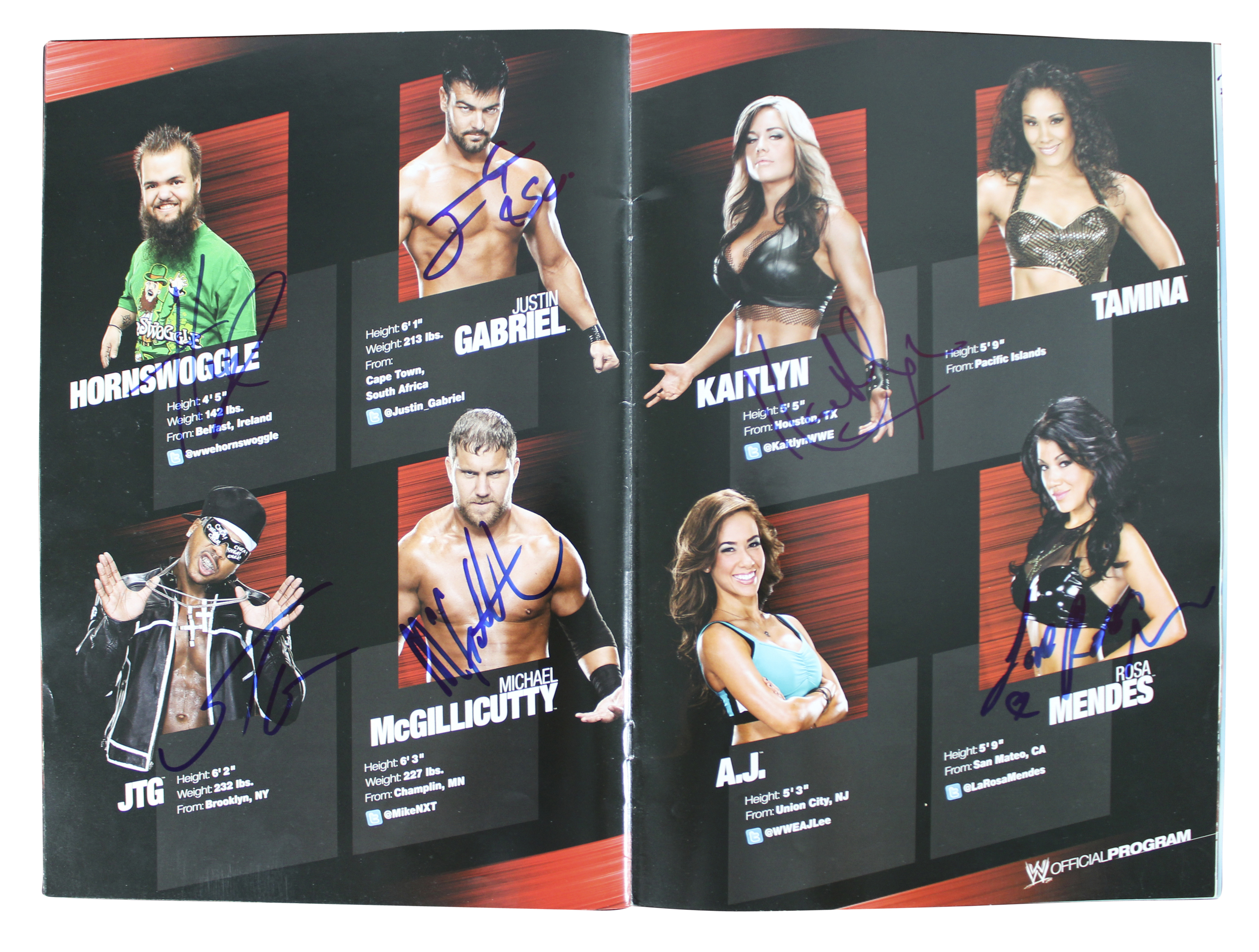 This Autographed 9.15x13.25 WWE Official Program has been Personally Signed by Rey Mysterio, Kane, The Miz, Sheamus, Albert Del Rio, Ricardo Rodriguez, R-Truth, Alex Riley, Dolph Ziggler, Cody Rhodes, Eve, Kelly Kelly, Alicia Fox, Kofi Kingston, Jack Swagger, Wade Barrett, Sin Cara, Brie Bella, Nikki Bella, Beth Phoenix, Natalya, Jinder Mahal, Santino Marella, Zack Ryder, John Laurinaitis, Mason Ryan, Yoshi Tatsu, Jimmy Uso, Jey Uso, Rosa Mendes, Kaitlyn, Justin Gabriel, Hornswoggle, JTG, Michael McGillicutty, Tyler Reks, Heath Slater, Johnny Curtis, Tyson Kidd, Curt Hawkins, Aksana, Naomi, Vikie Guerrero, Matt Striker, Michael Cole, Jerry Lawler, Booker T & Scott Stanford. This item is 100% Authentic to include a Certificate of Authenticity (COA) / hologram by Beckett Authentication Services. The authenticity can be verified on Beckett Authentication Services website.