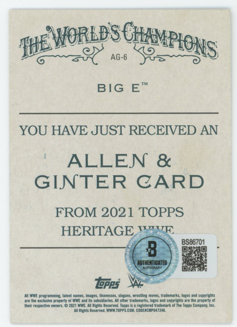 This Autographed 2021 Topps #AG-6 Card has been Personally Signed by Big E of the World Wrestling Entertainment. This item is 100% Authentic to include a hologram by Beckett Authentication Services. This item will come with an affixed Beckett Authentication Services (BAS) authentication sticker, which includes a scannable QR code to verify authenticity. Please note that Beckett no longer provides serial-numbered COA cards, and the attached BAS sticker will serve as the complete authentication for this item. The authenticity can be verified on Beckett Authentication Services website.