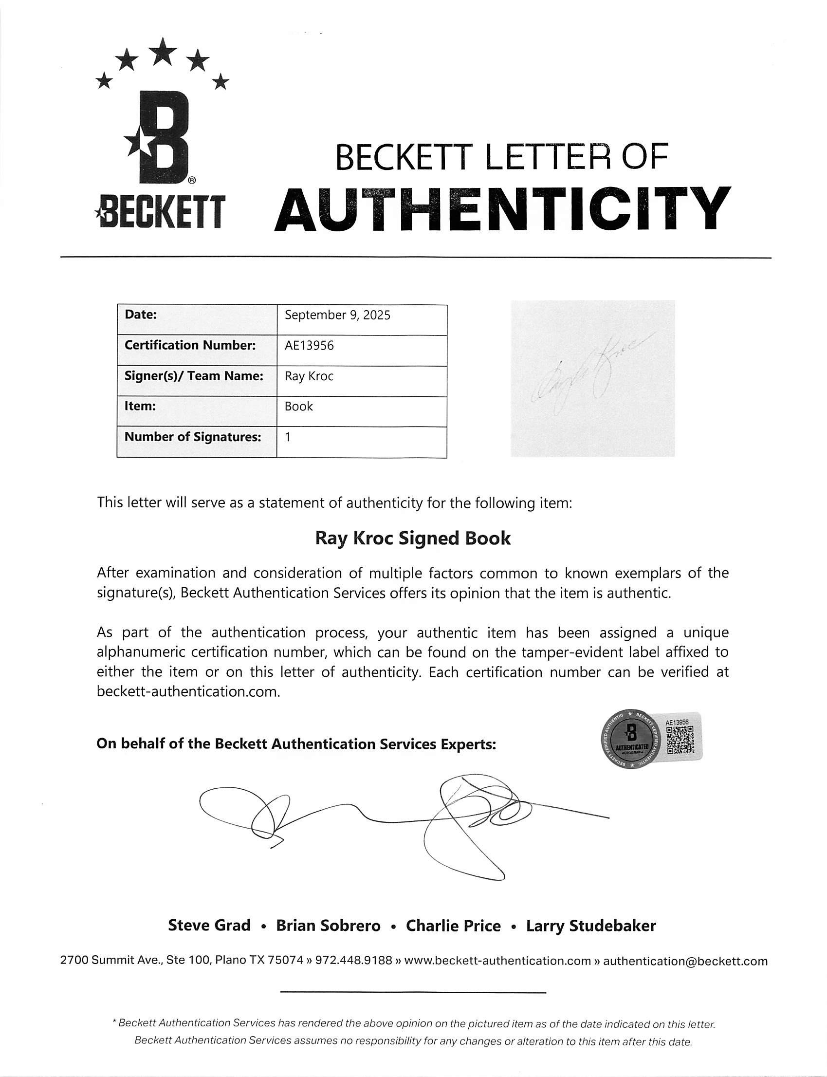 This Autographed Grinding It Out: The Making of McDonald's Hard Cover Book has been Personally Signed by Ray Kroc of McDonald's. This item is 100% Authentic to include a Certificate of Authenticity (COA) / hologram by Beckett Authentication Services. The authenticity can be verified on Beckett Authentication Services website.