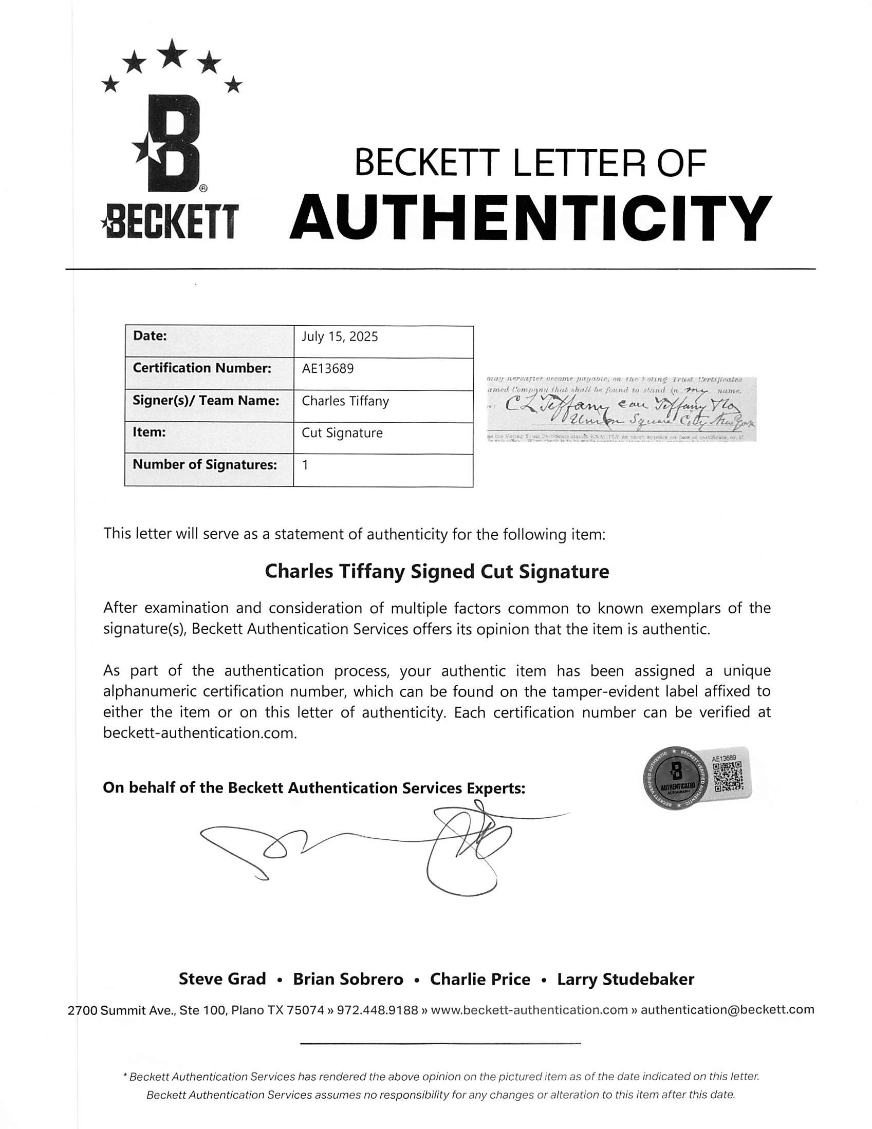 This Autographed & Framed 1.5x9.5 Cut Signature has been Personally Signed by Charles Tiffany. This item is 100% Authentic to include a Certificate of Authenticity (COA) / hologram by Beckett Authentication Services. The authenticity can be verified on Beckett Authentication Services website. This item has been professionally framed to overall dimensions of approximately 26 x 35 inches.
