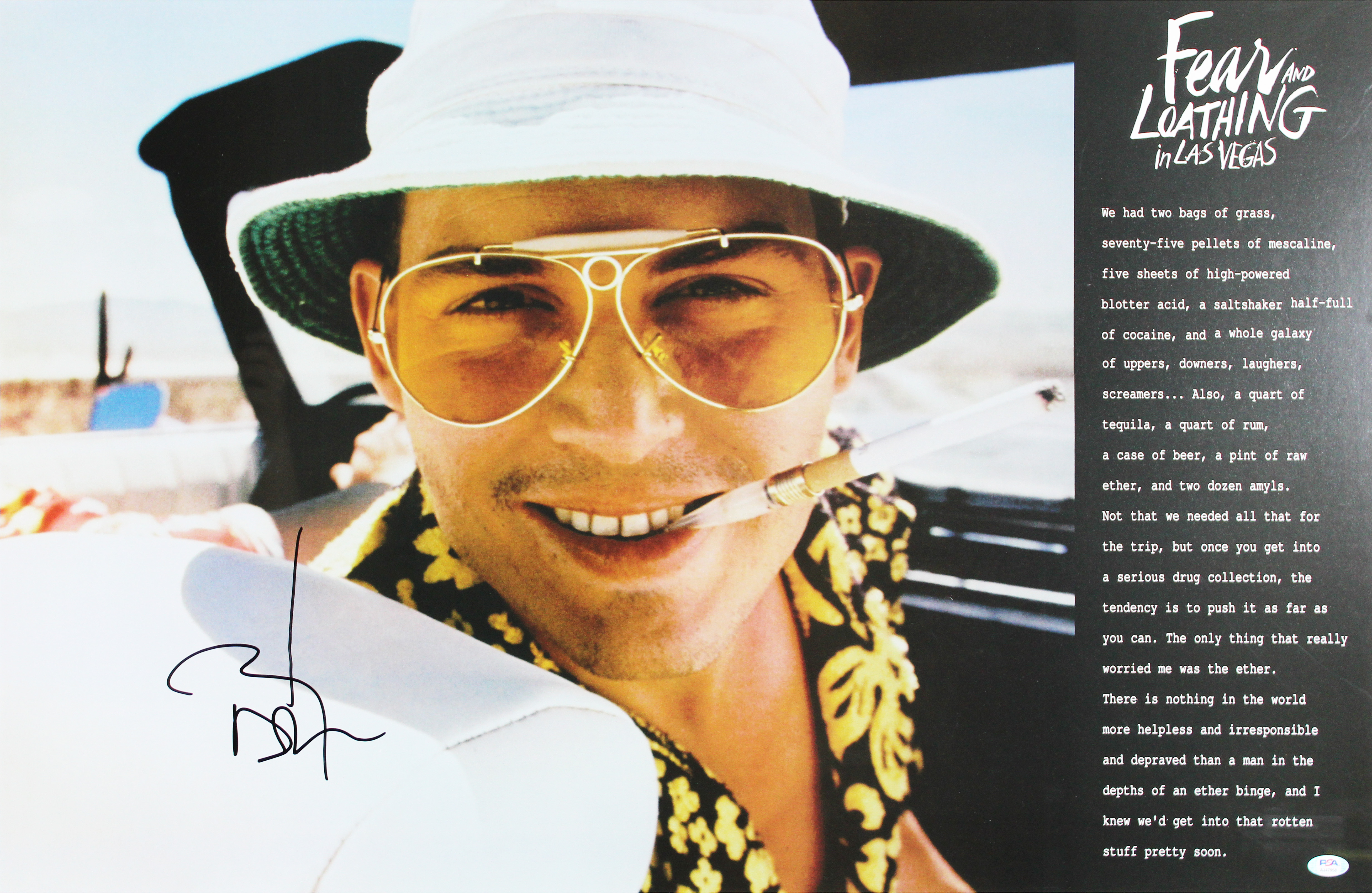 This Autographed 24x36 Framed Poster has been Personally Signed by Johnny Depp of Fear And Loathing In Las Vegas. This item is 100% Authentic and comes with a PSA/DNA Certification numbered Hologram. Please note that PSA/DNA no longer provides serial-numbered COA cards, and the attached PSA/DNA sticker will serve as the complete authentication for this item. The authenticity can be verified on Professional Sports Authenticators website. This item has been professionally framed to overall dimensions of approximately 33.5 x 44.5 inches.