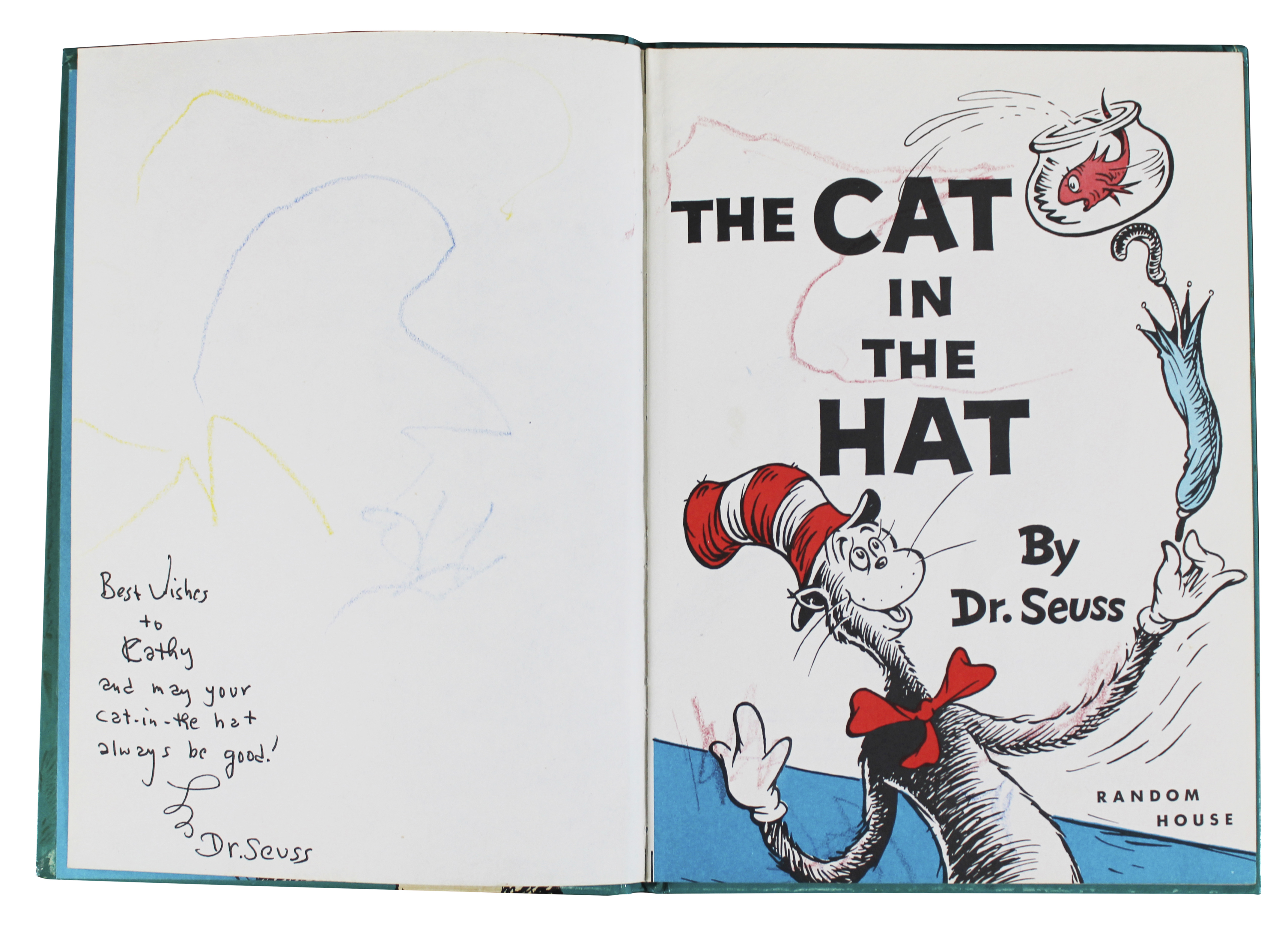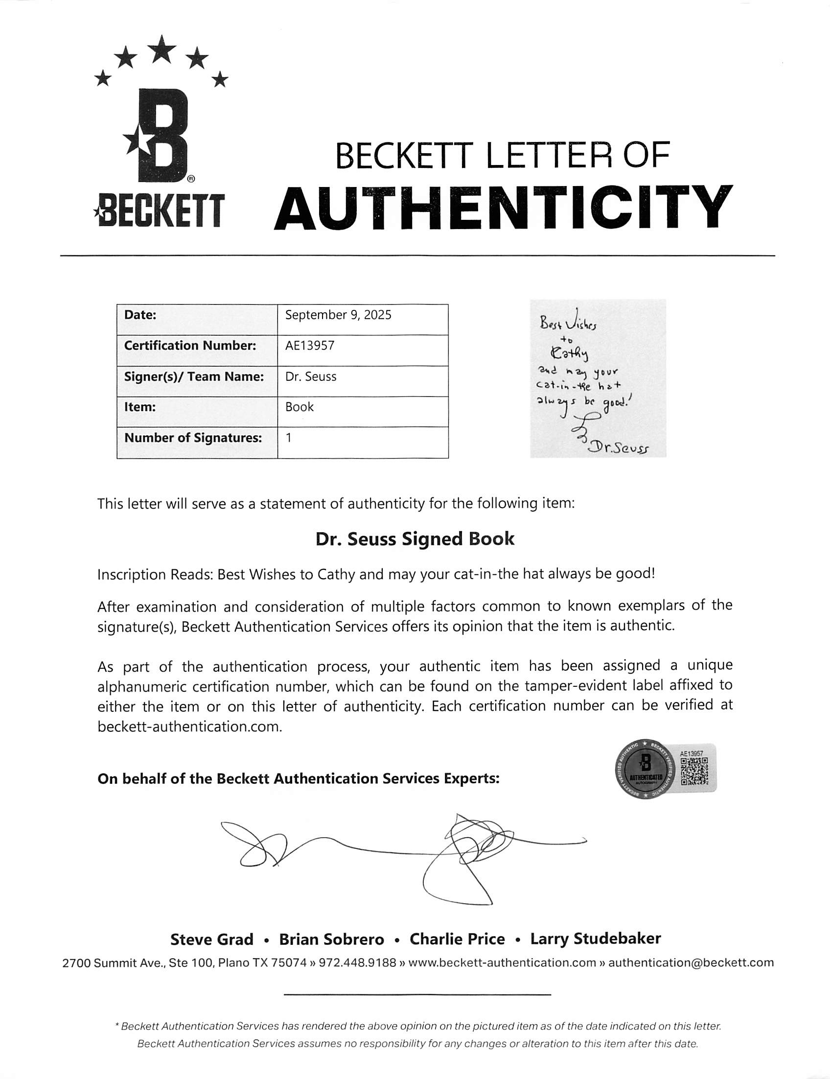 This Autographed The Cat in the Hat Hardcover w/ Slipcase Book with the inscription of "Best Wishes to Cathy and may your cat-in-the-hat always be good!" has been Personally Signed by Dr. Seuss. This item is 100% Authentic to include a Certificate of Authenticity (COA) / hologram by Beckett Authentication Services. The authenticity can be verified on Beckett Authentication Services website.