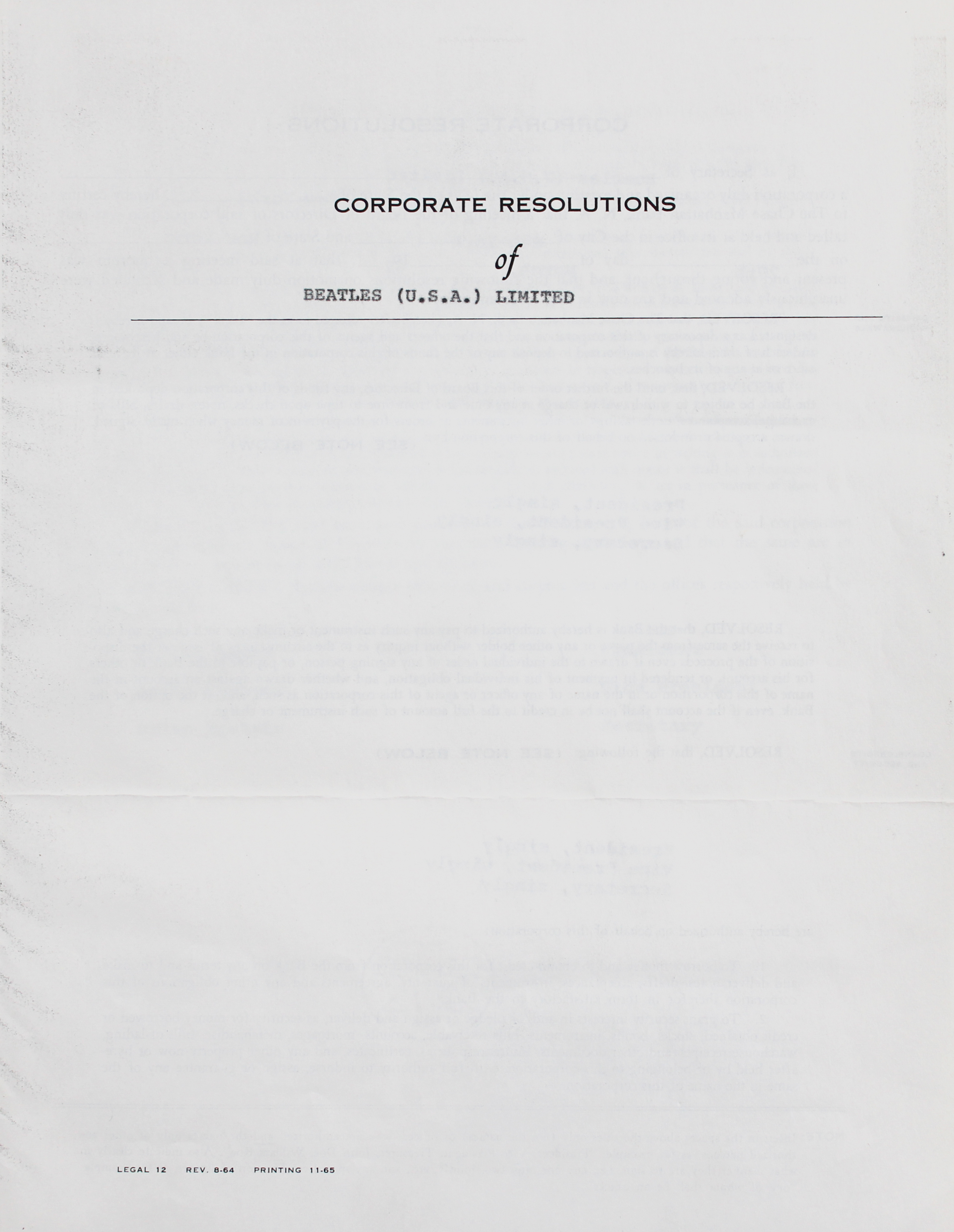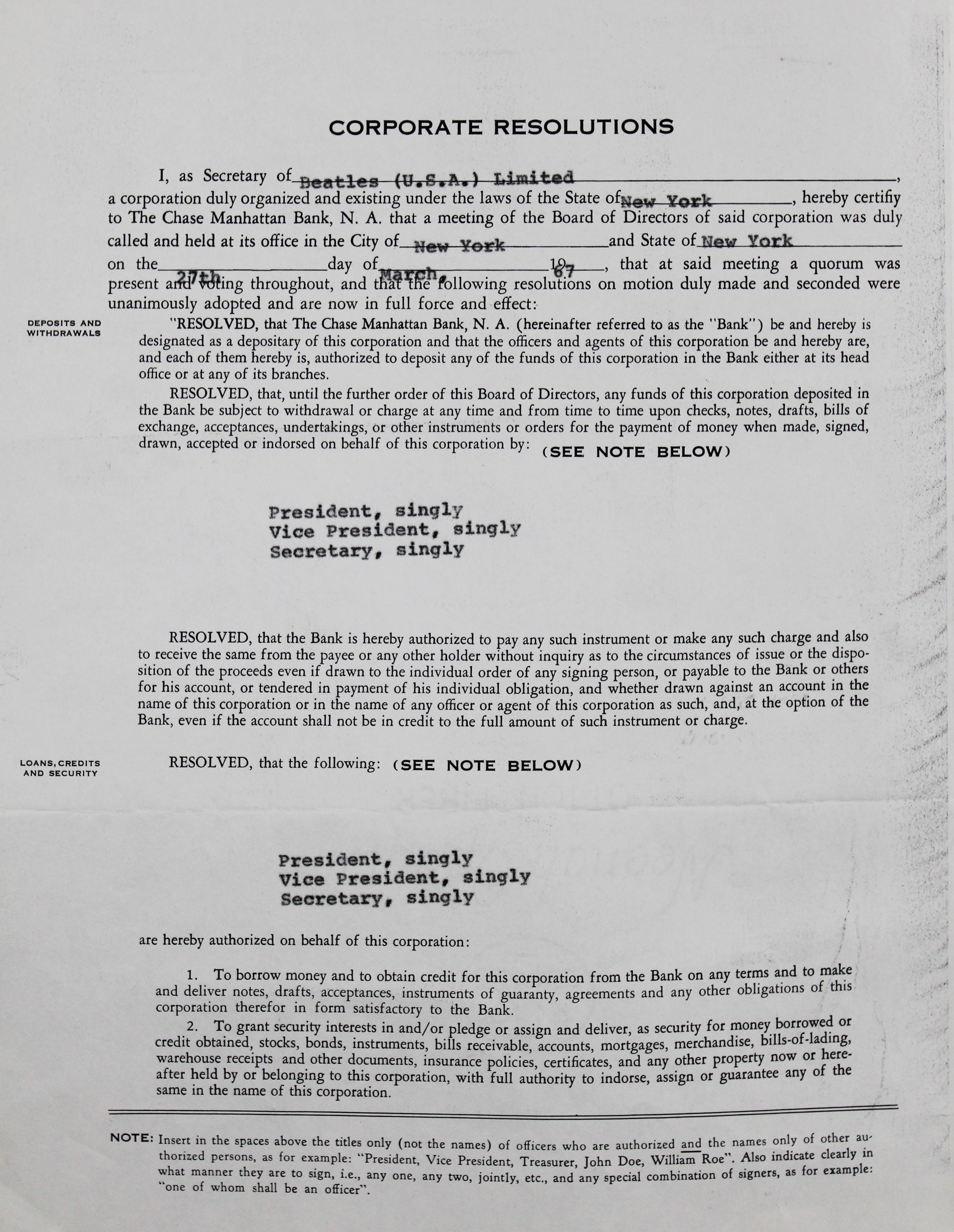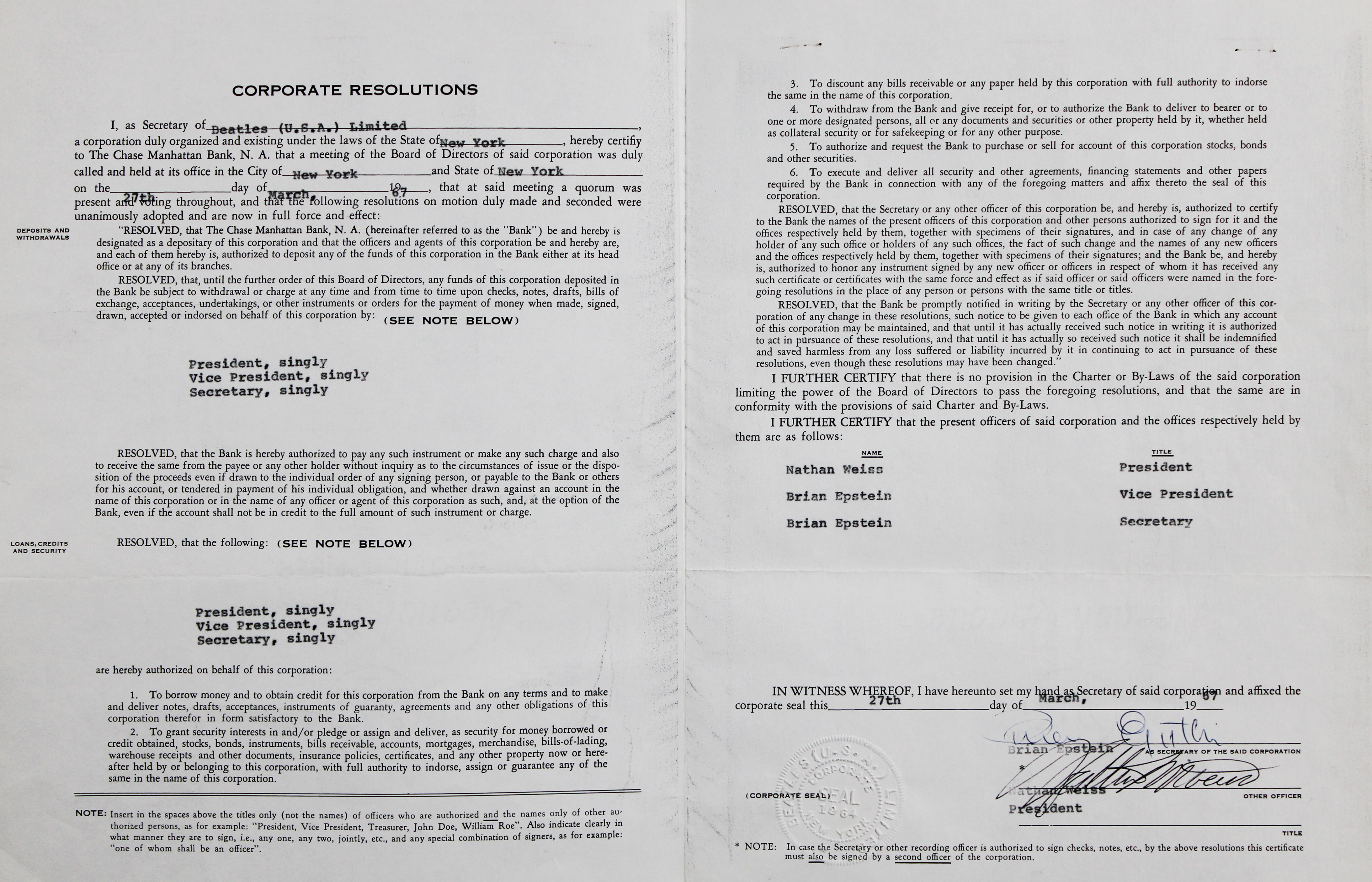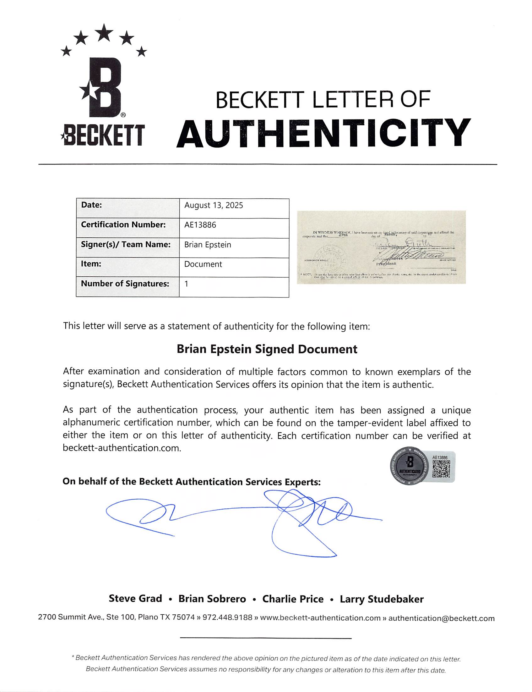This Autographed 4-page 8.5x11 typed contract, dated March 27, 1967, has been personally signed by Brian Epstein, legendary manager of The Beatles. The item is 100% authentic and includes a Certificate of Authenticity (COA) with hologram from Beckett Authentication Services, which can be verified on Beckett���s website. Epstein signed as Vice President and Secretary of Beatles U.S.A. Limited, countersigned by Nathan M. Weiss as President. The Beatles��� blind-embossed corporate seal appears beside their signatures. The document shows only very light handling wear, remains in near fine condition, and is exceedingly scarce. This corporate resolution was executed just five months before Epstein���s tragic death. It records a special meeting of Beatles U.S.A. Limited, confirming the replacement of Walter and Sandra Hofer with Nathan Weiss as director. The document originates from the estate of Walter Hofer, the entertainment lawyer whom Epstein hired to help the Beatles enter the U.S. market, including negotiating the landmark Ed Sullivan Show appearances. In addition to naming the new director and designating Chase as the Beatles��� official bank, this resolution granted Epstein and Weiss broad powers to act on behalf of the corporation ��� including borrowing money and granting security interests. Weiss, a close personal friend of Epstein, would later partner with him to form the management company Nemperor Records. This historically significant contract links directly to Brian Epstein���s management of the Beatles at the height of their fame, offering a rare and tangible connection to the business dealings that shaped the band���s U.S. success.