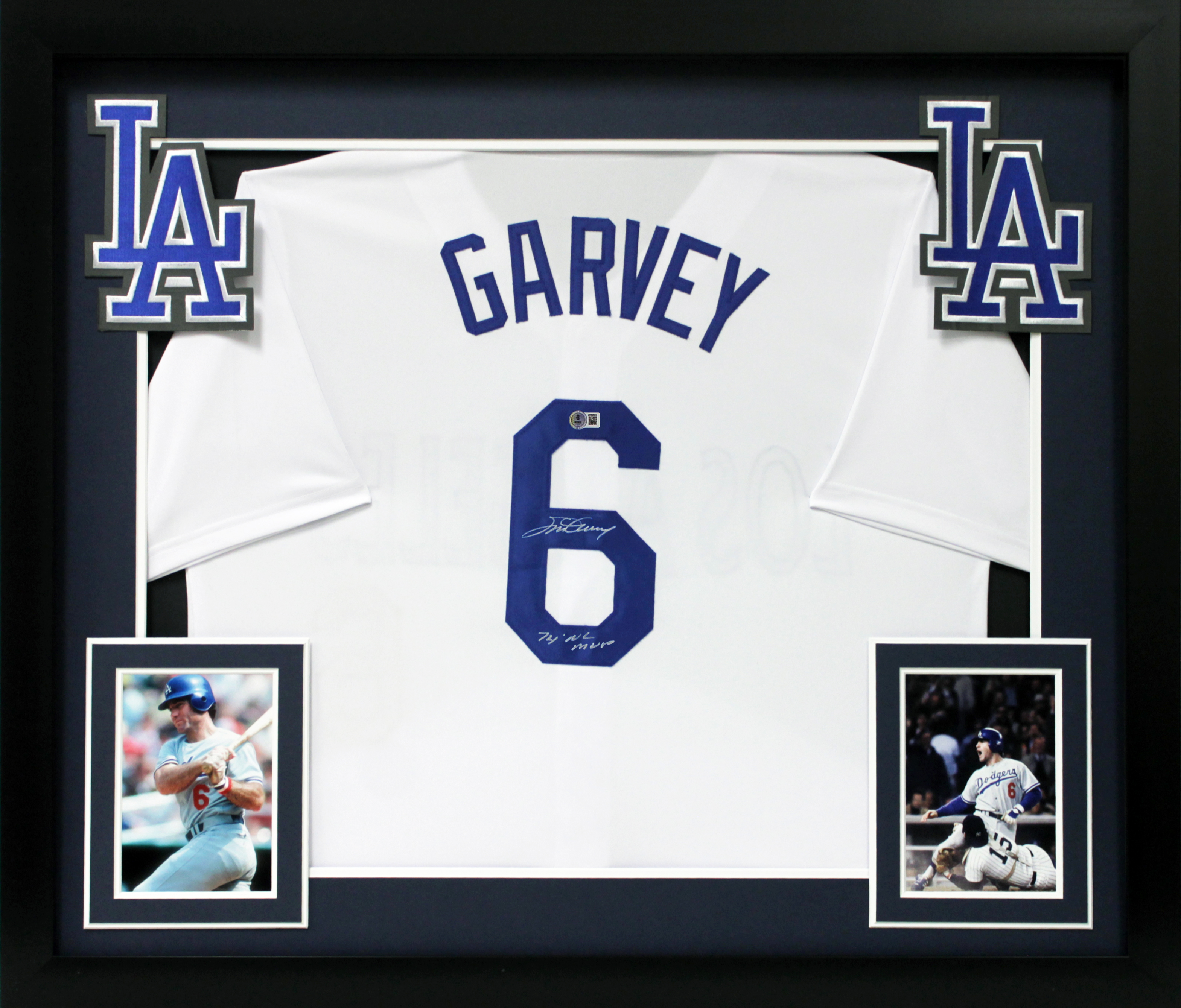 This Autographed White Pro Style Framed Jersey with the inscription of "74 NL MVP" has been Personally Signed by Steve Garvey of the Los Angeles Dodgers. This item is 100% Authentic to include a hologram by Beckett Authentication Services. This item will come with an affixed Beckett Authentication Services (BAS) authentication sticker, which includes a scannable QR code to verify authenticity. Please note that Beckett no longer provides serial-numbered COA cards, and the attached BAS sticker will serve as the complete authentication for this item. This is a BAS Witnessed Protection Program item which means a Beckett Authentication Service representative was present when this item was being signed. We conducted an autograph signing with Steve Garvey where multiples of the same item were signed. While the photographs are representative of this item, the size, placement and strength of the signature may vary. Each item is hand signed, therefore, each autograph is unique. This item can be verified through BAS Witnessed. This item has been professionally framed to overall dimensions of approximately 32 x 37 inches. This is a X-Large sized, non-branded, custom-stitched Framed Jersey. This jersey will be framed to order, it will take approximately 3-4 business days from purchase date for it to ship.