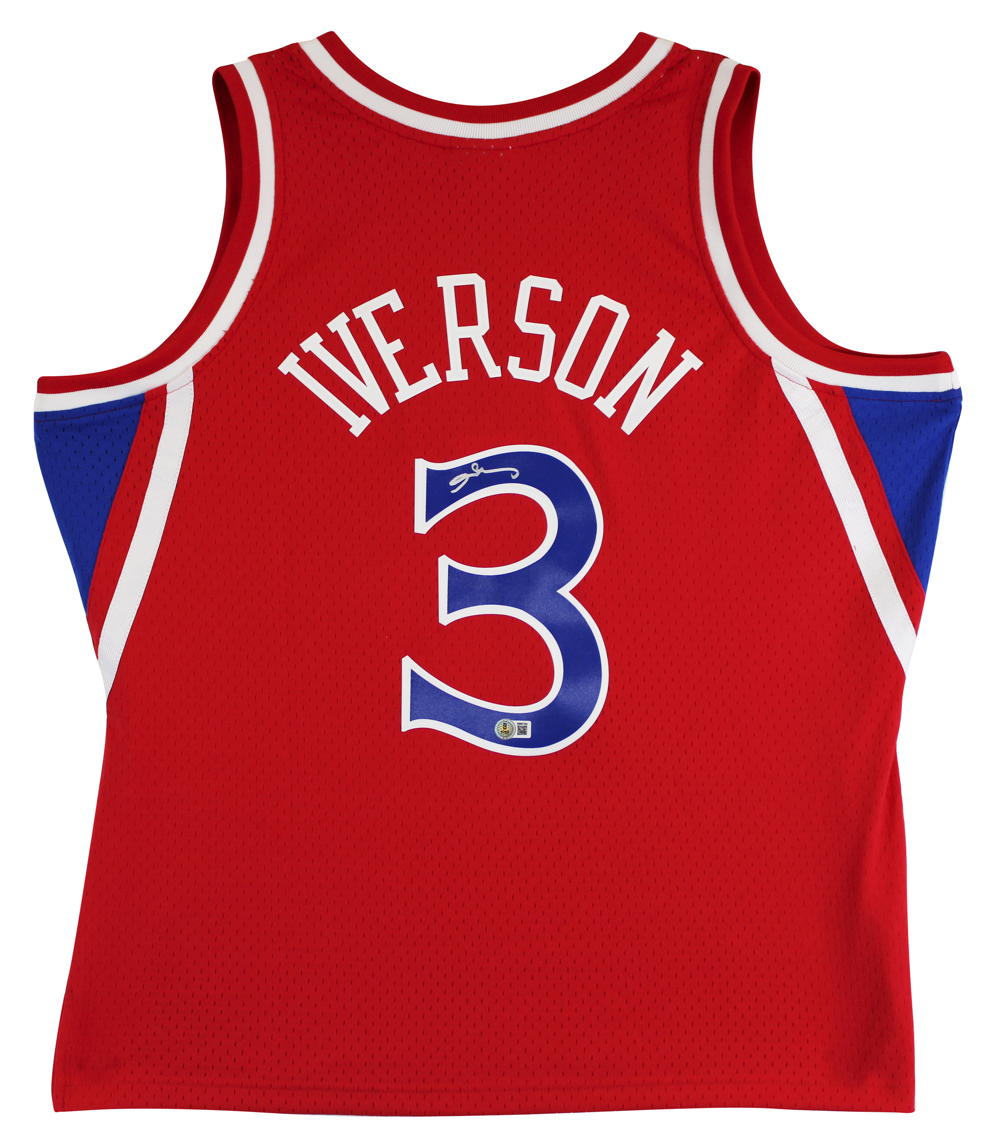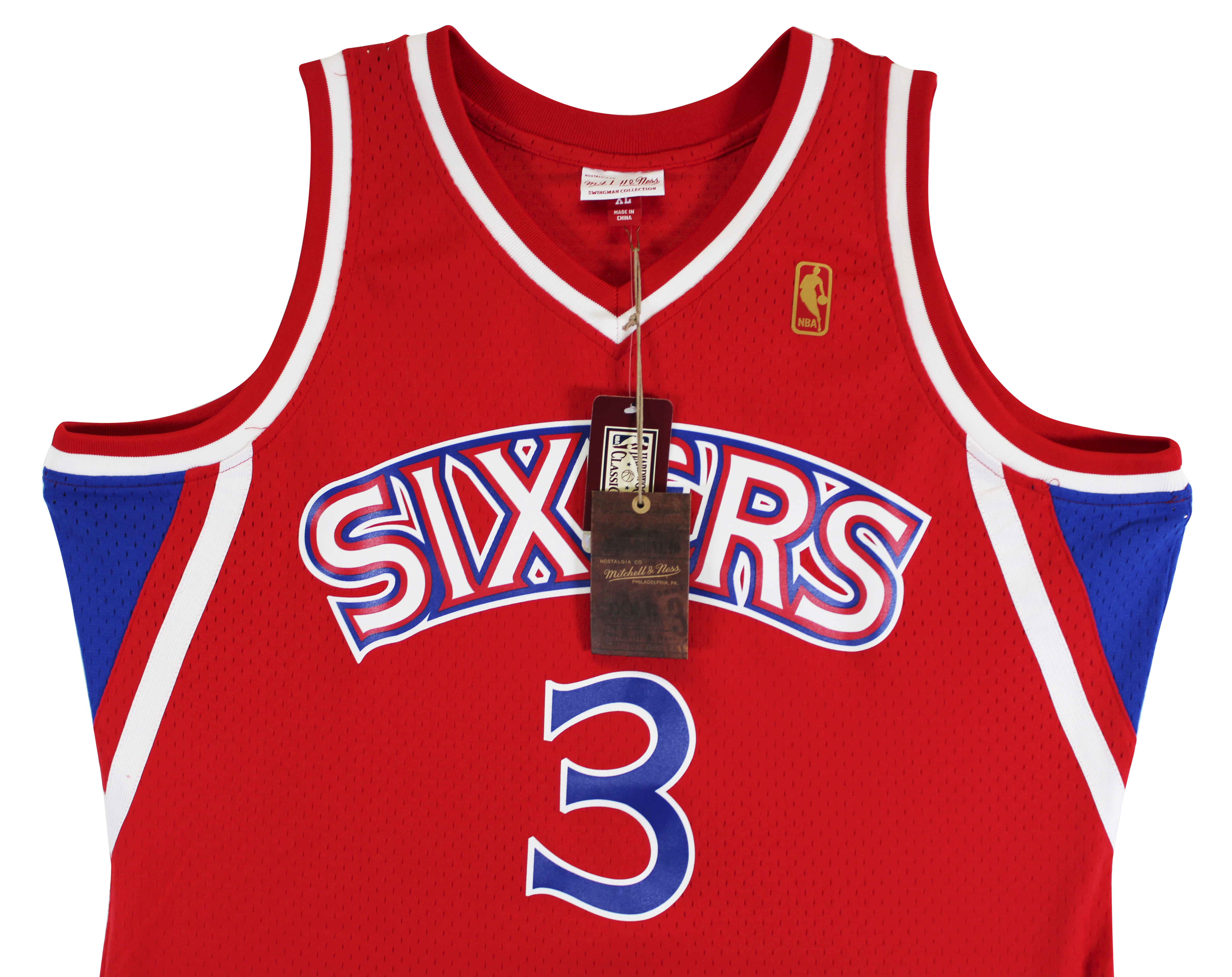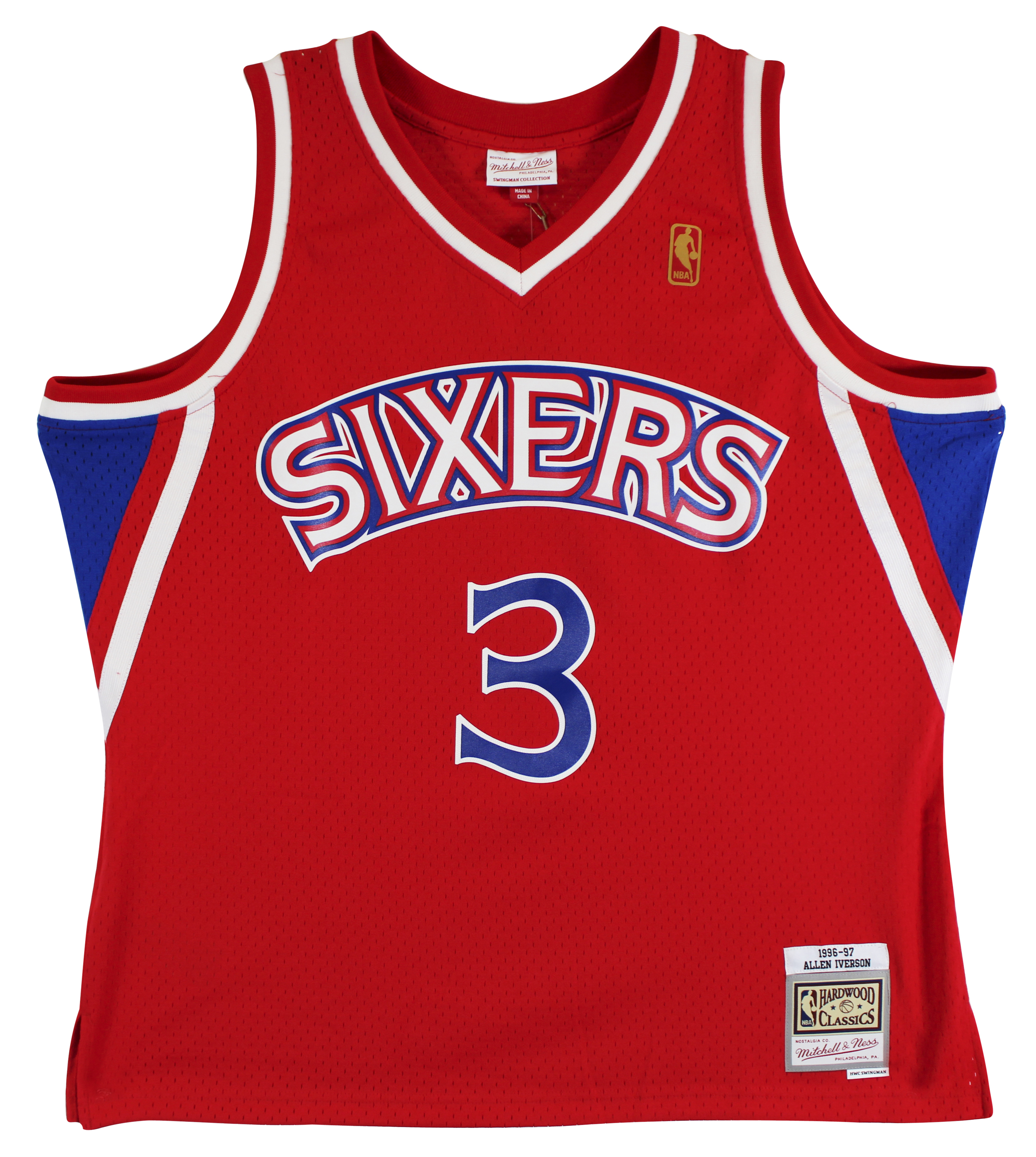 This Autographed Red 1996-97 Mitchell & Ness Hardwood Classics Swingman Jersey has been Personally Signed by Allen Iverson of the Philadelphia 76ers. This item is 100% Authentic to include a hologram by Beckett Authentication Services. This item will come with an affixed Beckett Authentication Services (BAS) authentication sticker, which includes a scannable QR code to verify authenticity. Please note that Beckett no longer provides serial-numbered COA cards, and the attached BAS sticker will serve as the complete authentication for this item. This is a BAS Witnessed Protection Program item which means a Beckett Authentication Service representative was present when this item was being signed. We conducted an autograph signing with Allen Iverson where multiples of the same item were signed. While the photographs are representative of this item, the size, placement and strength of the signature may vary. Each item is hand signed, therefore, each autograph is unique. This item can be verified through BAS Witnessed. This is a X-Large sized Jersey.
