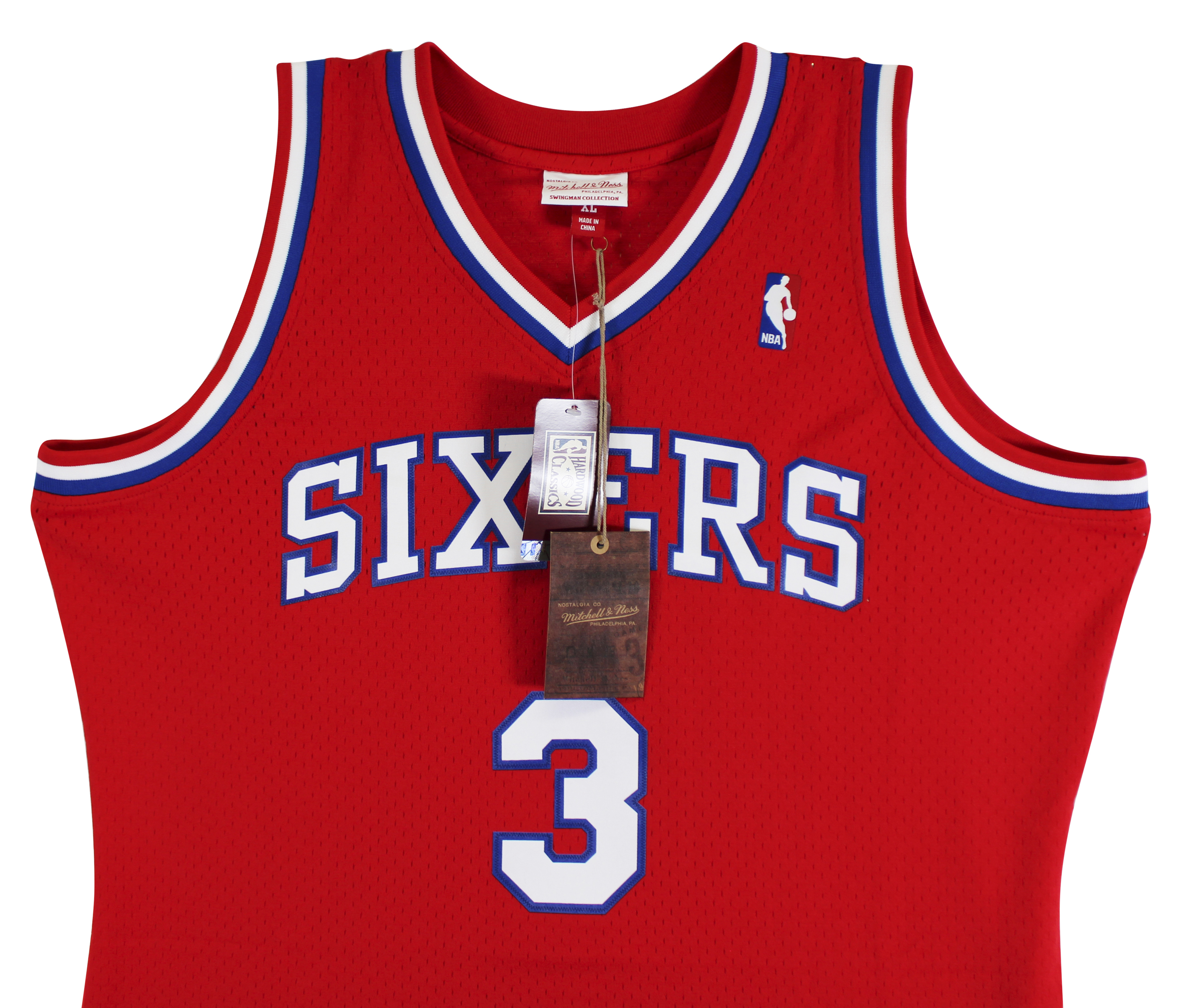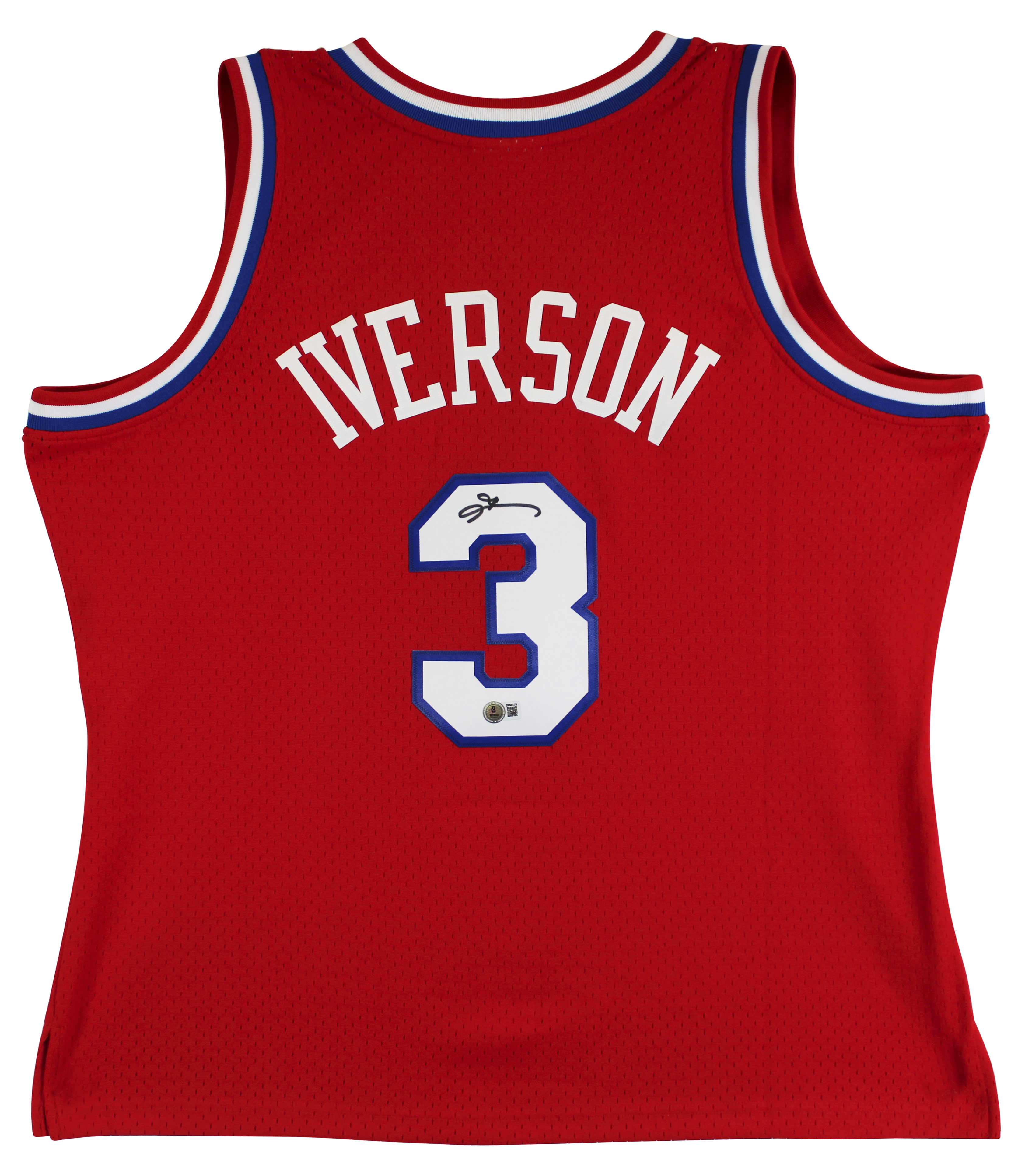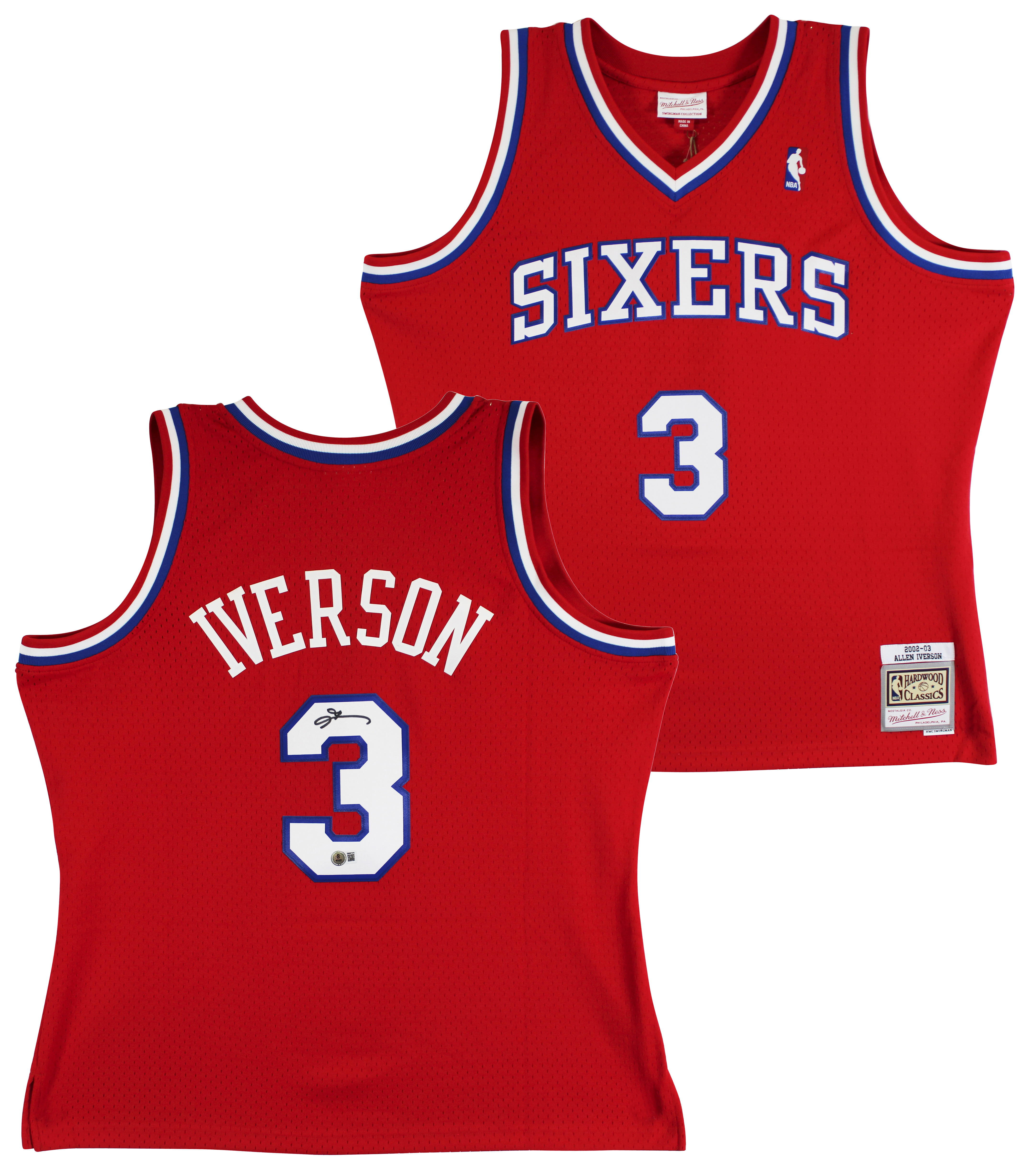 This Autographed Red 2002-03 Mitchell & Ness Hardwood Classics Swingman Jersey has been Personally Signed by Allen Iverson of the Philadelphia 76ers. This item is 100% Authentic to include a hologram by Beckett Authentication Services. This item will come with an affixed Beckett Authentication Services (BAS) authentication sticker, which includes a scannable QR code to verify authenticity. Please note that Beckett no longer provides serial-numbered COA cards, and the attached BAS sticker will serve as the complete authentication for this item. This is a BAS Witnessed Protection Program item which means a Beckett Authentication Service representative was present when this item was being signed. We conducted an autograph signing with Allen Iverson where multiples of the same item were signed. While the photographs are representative of this item, the size, placement and strength of the signature may vary. Each item is hand signed, therefore, each autograph is unique. This item can be verified through BAS Witnessed. This is a X-Large sized Jersey.