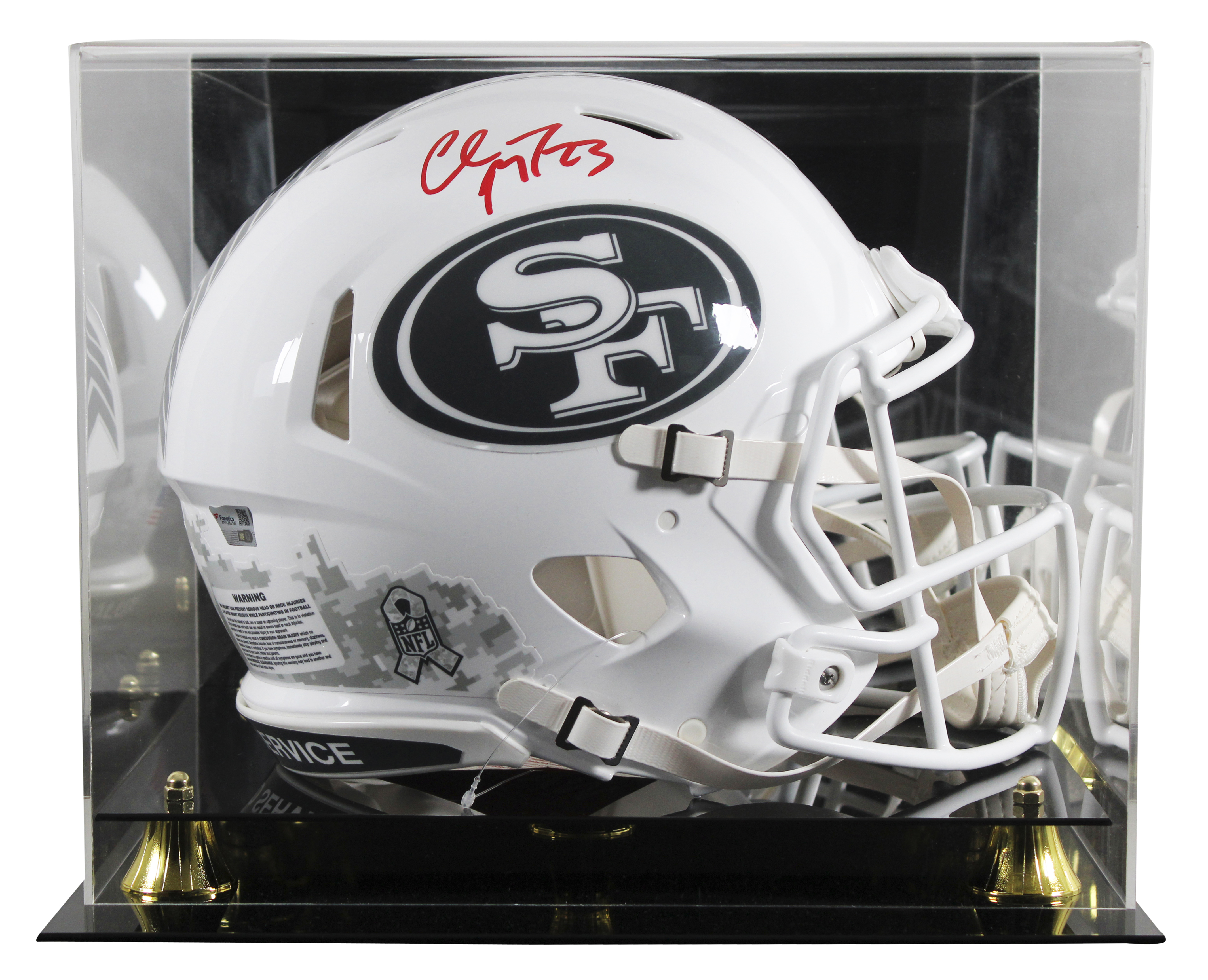 This Autographed Alternate 2024 Salute To Service III Riddell Full Size Speed Proline Helmet W/ Uv Mirrored Back Acrylic Display Case has been Personally Signed by Christian McCaffrey of the San Francisco 49ers. This item is 100% Authentic to includes a numbered hologram by Fanatics. We conducted an autograph signing with Christian McCaffrey where multiples of the same item were signed. While the photographs are representative of this item, the size, placement and strength of the signature may vary. Each item is hand signed, therefore, each autograph is unique. This item can be verified through Fanatics.