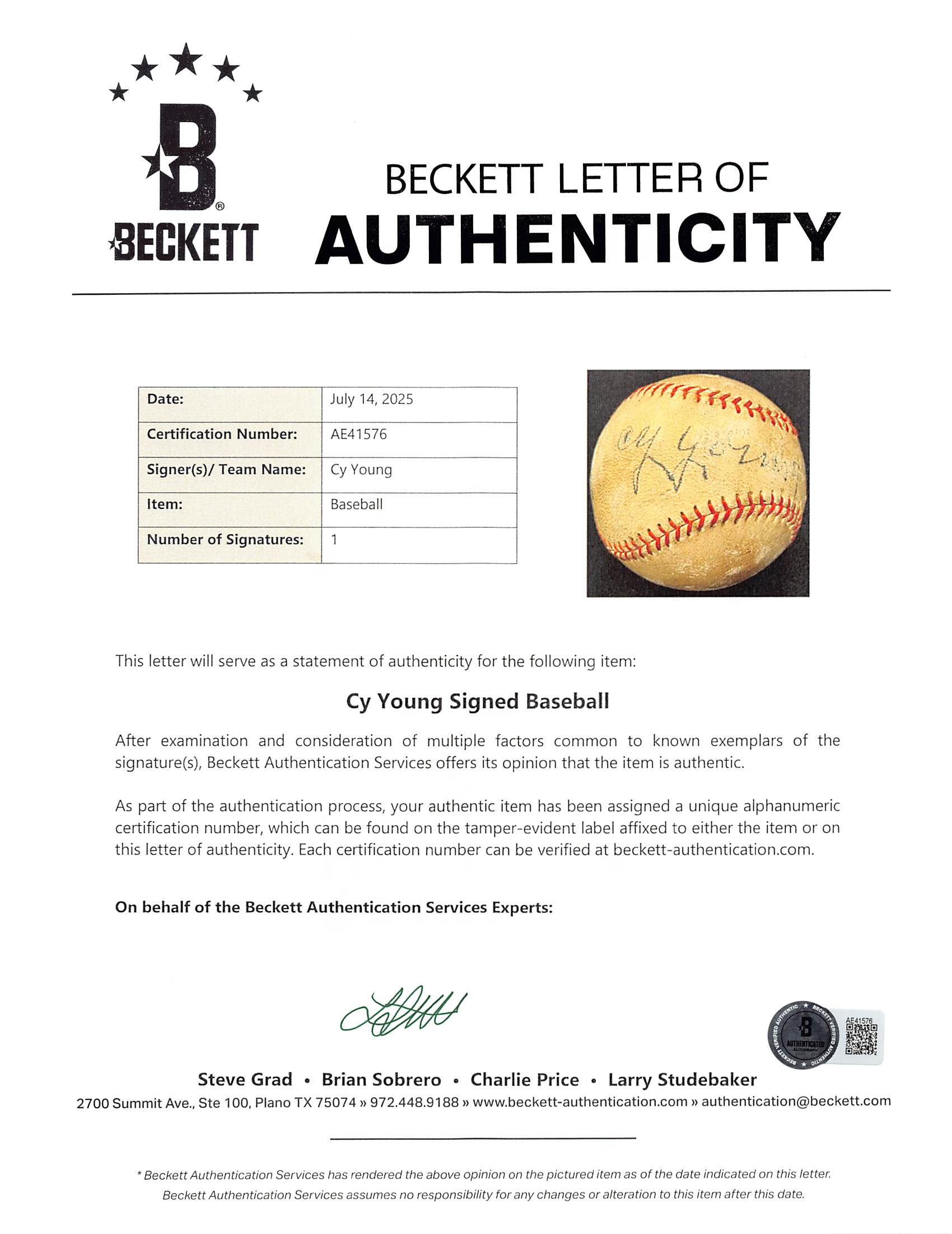 This Autographed Official Interstate League Baseball has been Personally Signed by Cy Young. This item is 100% Authentic to include a Certificate of Authenticity (COA) / hologram by Beckett Authentication Services. The authenticity can be verified on Beckett Authentication Services website.
