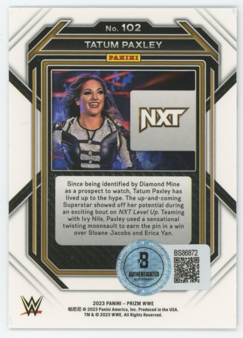 This Autographed 2023 Panini Prizm #102 Card has been Personally Signed by Tatum Paxley of the World Wrestling Entertainment. This item is 100% Authentic to include a hologram by Beckett Authentication Services. This item will come with an affixed Beckett Authentication Services (BAS) authentication sticker, which includes a scannable QR code to verify authenticity. Please note that Beckett no longer provides serial-numbered COA cards, and the attached BAS sticker will serve as the complete authentication for this item. The authenticity can be verified on Beckett Authentication Services website.