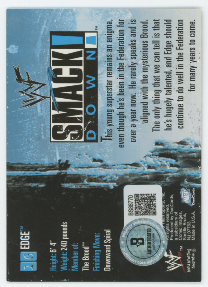 This Autographed 1999 Comic Images #16 Card has been Personally Signed by Edge of the World Wrestling Entertainment. This item is 100% Authentic to include a hologram by Beckett Authentication Services. This item will come with an affixed Beckett Authentication Services (BAS) authentication sticker, which includes a scannable QR code to verify authenticity. Please note that Beckett no longer provides serial-numbered COA cards, and the attached BAS sticker will serve as the complete authentication for this item. The authenticity can be verified on Beckett Authentication Services website.