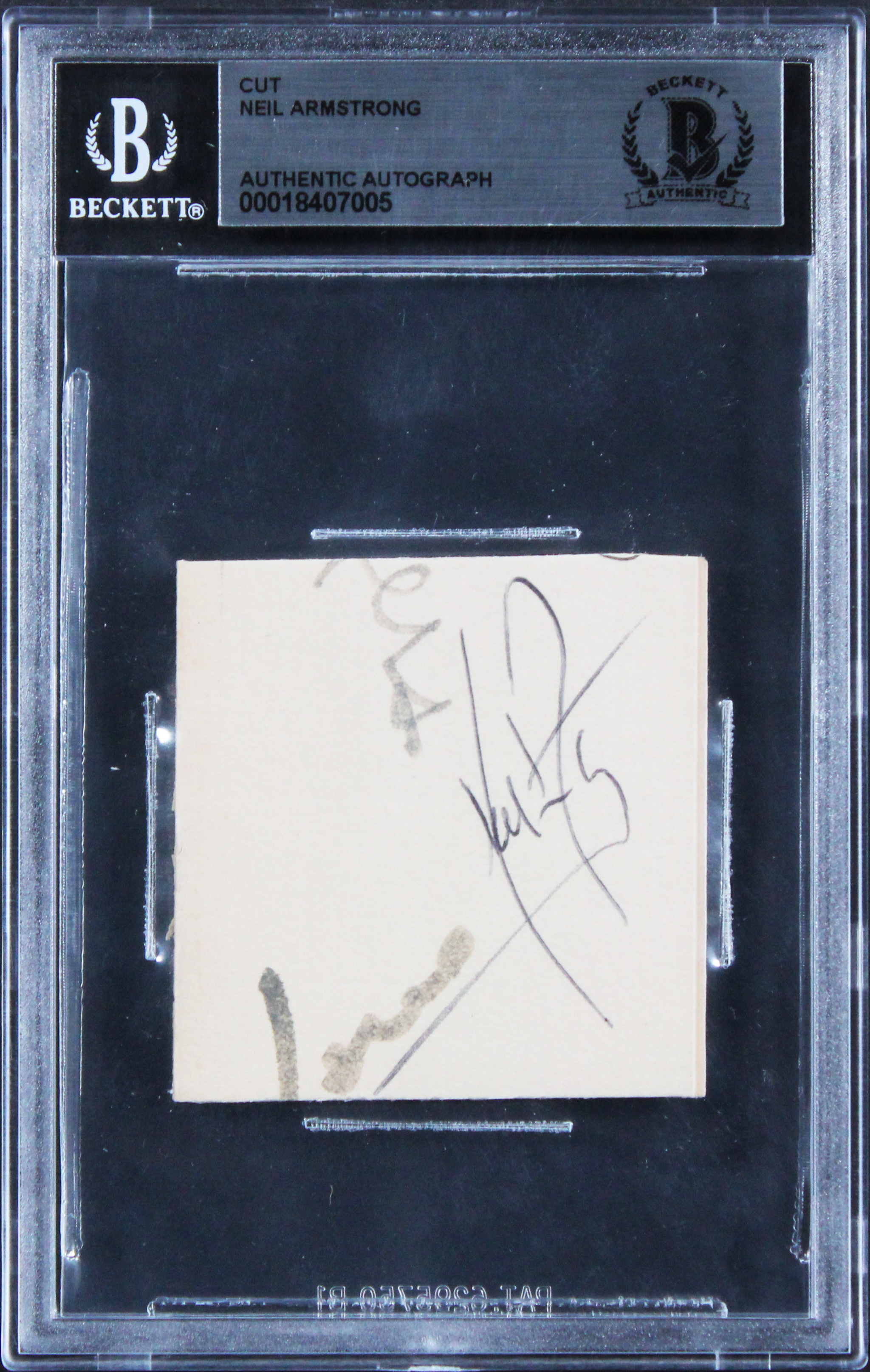 This Autographed 2x2 Cut Signature has been Personally Signed by Neil Armstrong of Apollo 11. This item is 100% Authentic, it comes slabbed and authenticated by Beckett Authentication Services. The authenticity can be verified on Beckett Authentication Services website.
