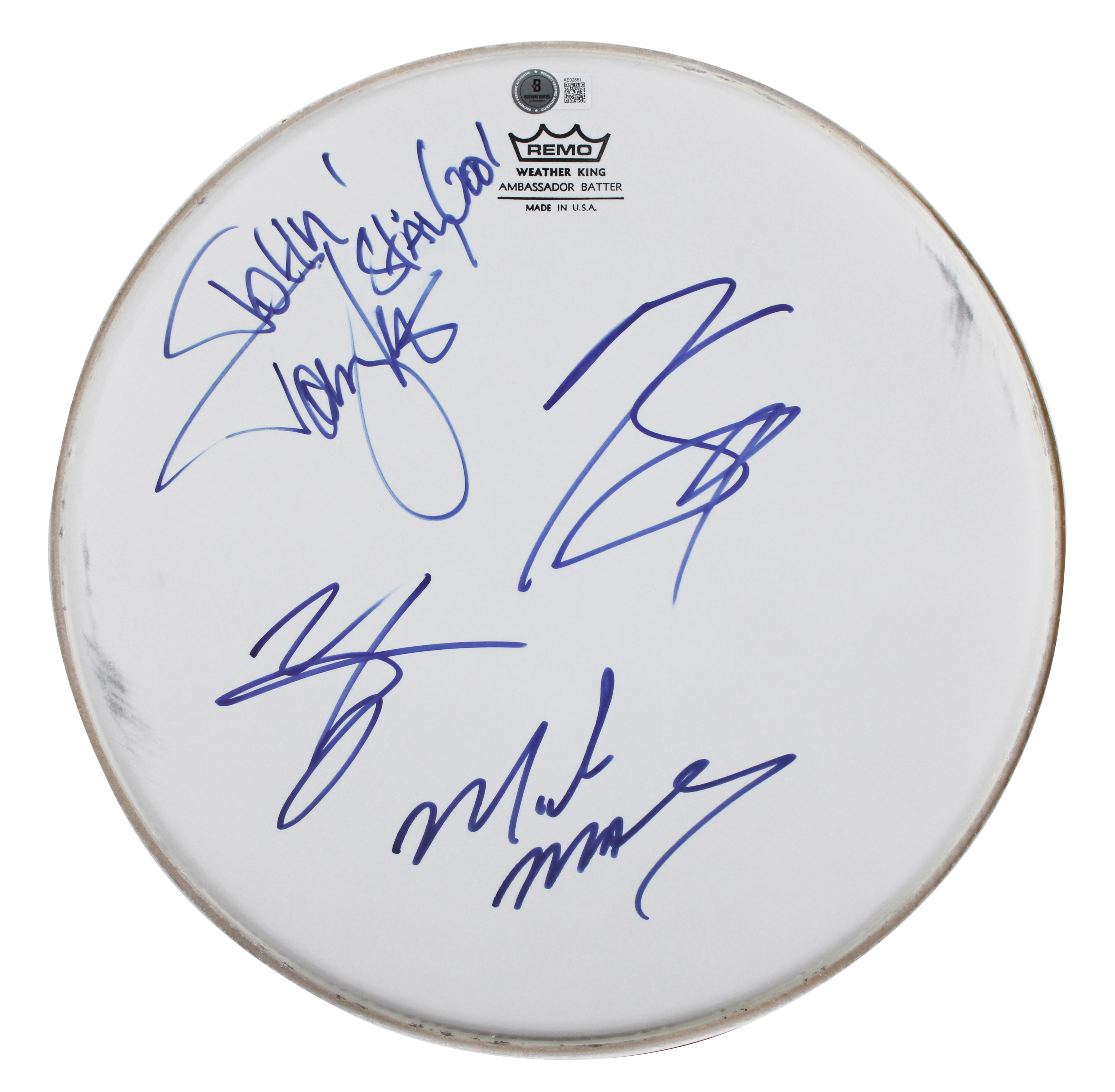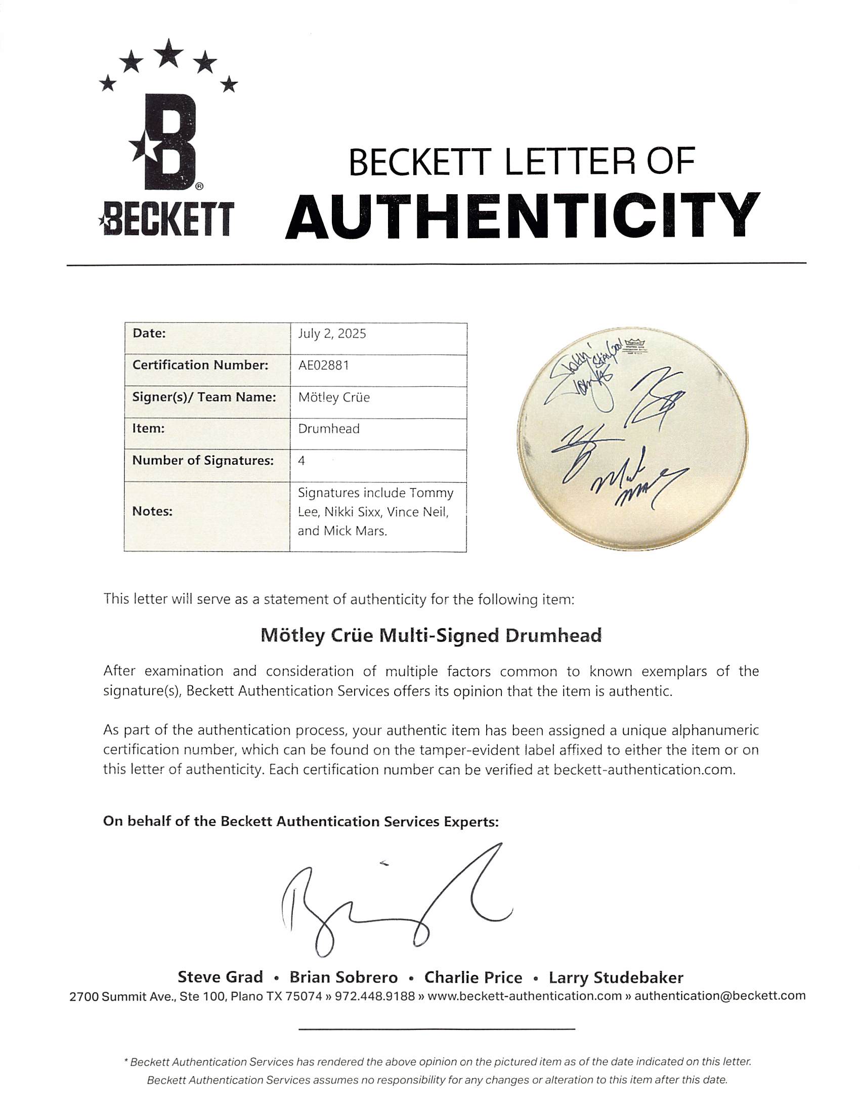 This Autographed 13 Inch Remo Drum Head has been Personally Signed by Tommy Lee, Nikki Sixx, Vince Neil, and Mick Mars of Motley Crue. This item is 100% Authentic to include a Certificate of Authenticity (COA) / hologram by Beckett Authentication Services. The authenticity can be verified on Beckett Authentication Services website.
