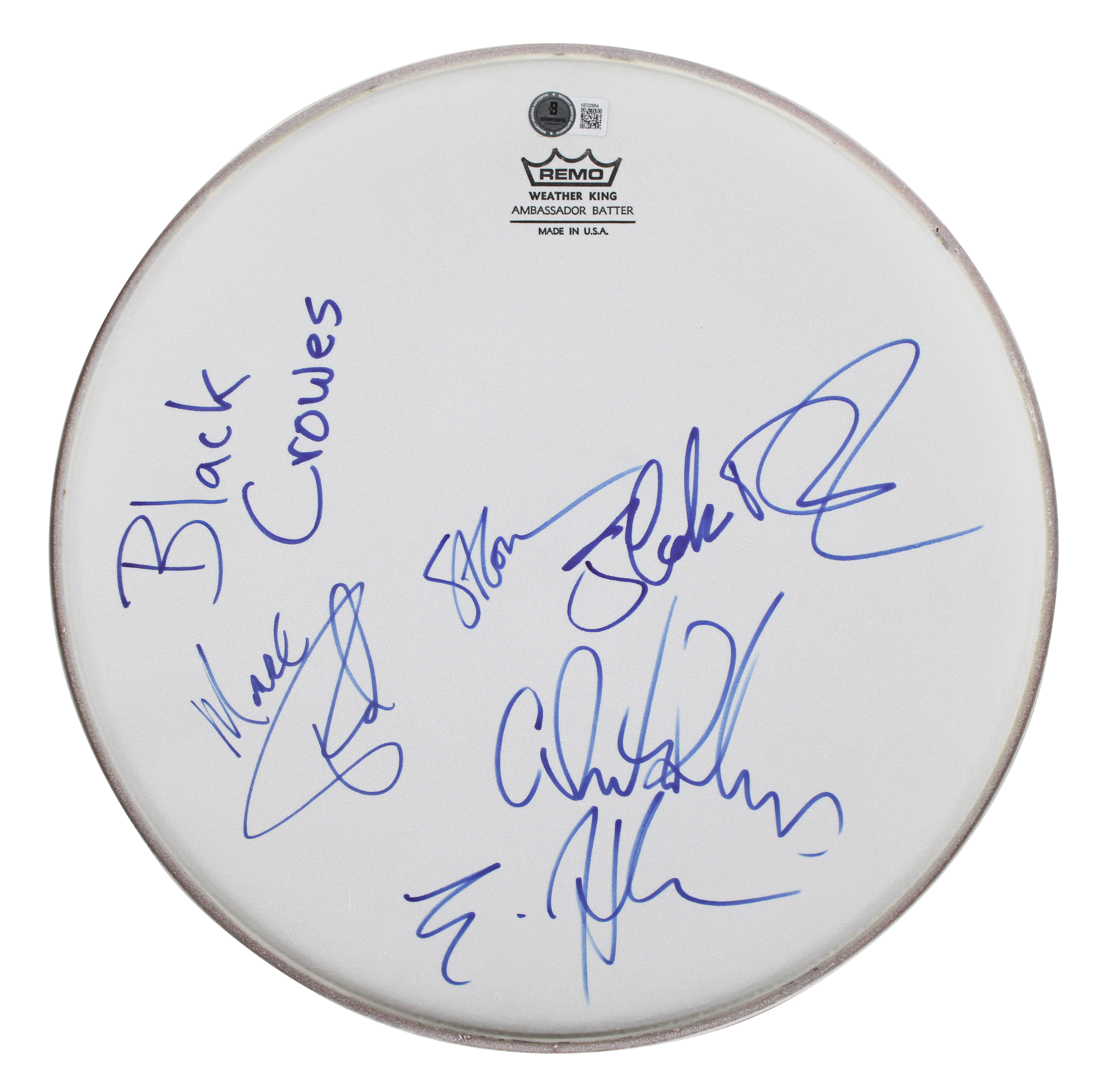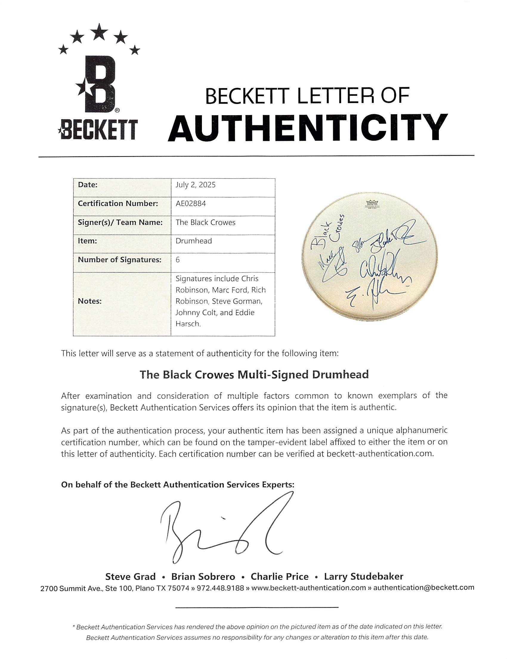 This Autographed 13 Inch Remo Drum Head has been Personally Signed by Chris Robinson, Marc Ford, Rich Robinson, Steve Gorman, Johnny Colt, and Eddie Harsch of The Black Crowes. This item is 100% Authentic to include a Certificate of Authenticity (COA) / hologram by Beckett Authentication Services. The authenticity can be verified on Beckett Authentication Services website.