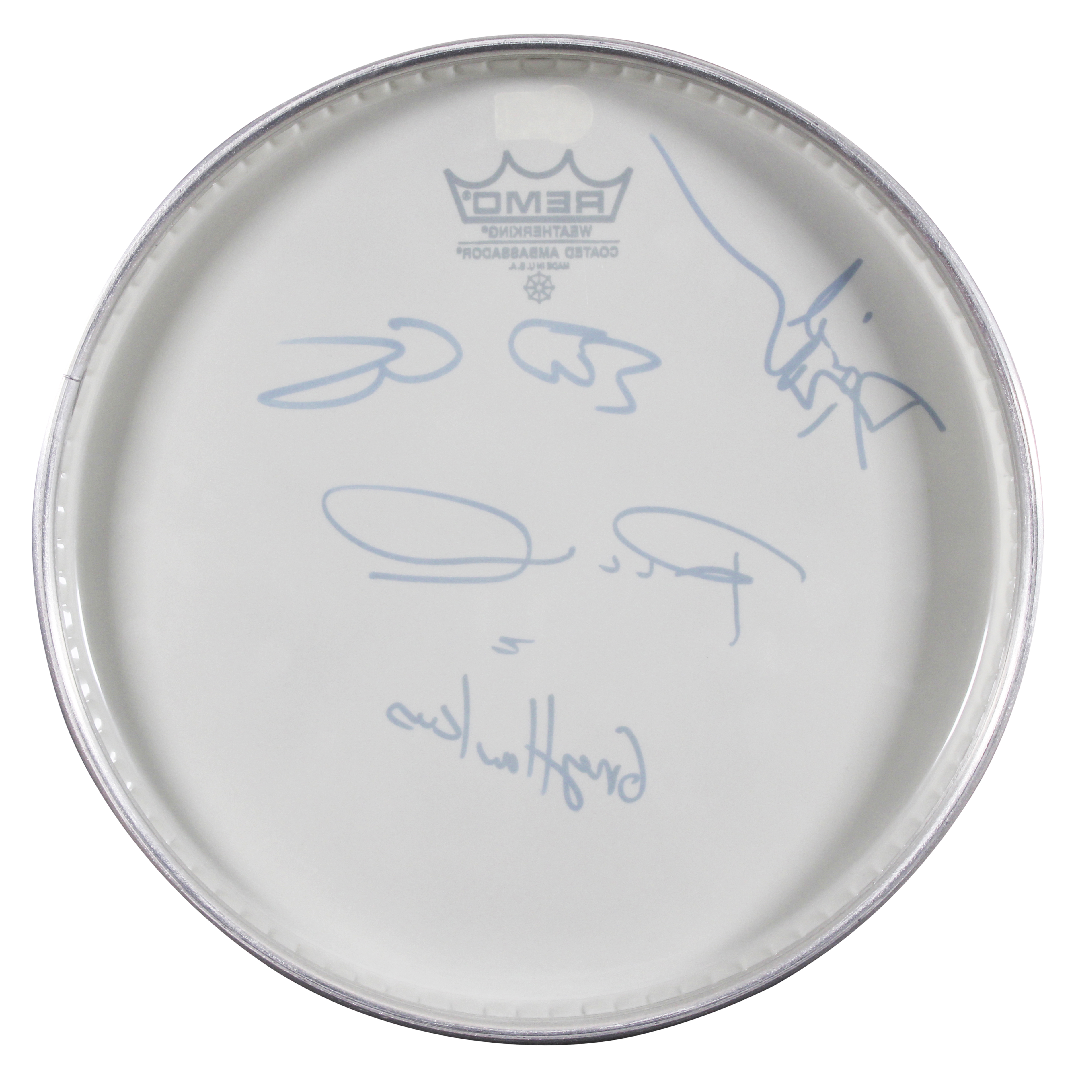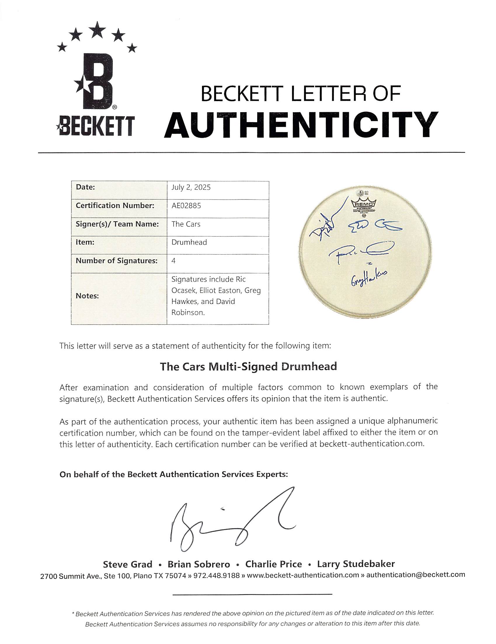 This Autographed 10 Inch Remo Drum Head has been Personally Signed by Ric Ocasek, Elliot Easton, Greg Hawkes, and David Robinson of The Cars. This item is 100% Authentic to include a Certificate of Authenticity (COA) / hologram by Beckett Authentication Services. The authenticity can be verified on Beckett Authentication Services website.